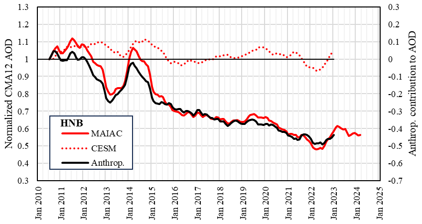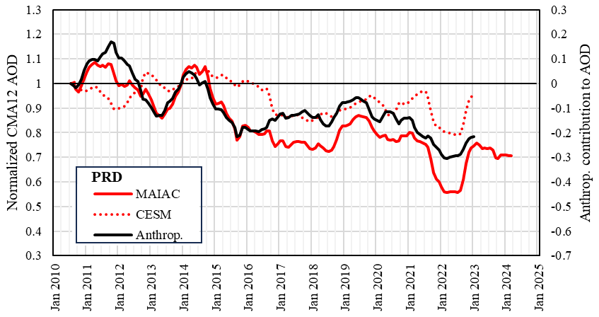 Figure 5Time series of CMA12-filtered MAIAC and CESM-simulated monthly mean AOD over the NCP from July 2010 to March 2024 and January 2023, respectively, normalized in July 2010. The black line shows the anthropogenic contribution to AOD (secondary vertical axis). The thin black line has been drawn to guide the eye.