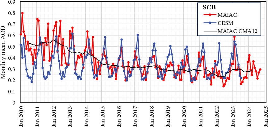 Time series of the monthly mean MAIAC AOD and CESM-simulated AOD over the SCB are presented in Fig. 12. The time series of the model-simulated AOD shows a regular pattern with distinct peaks in March and a minimum in July and (in most years) a second minimum in September. The simulated monthly mean AOD peak values are similar between 2010 and 2017, with some variation, whereas they are 10 %–16 % lower from 2018. The simulated monthly mean AOD values are initially smaller than the observed monthly mean MAIAC AOD values. In 2015 and 2016, the simulated and observed peak values match well; they also match well in 2020, 2021, and 2023, with smaller observed values in the years between 2016 and 2020 and in 2022. The MAIAC AOD pattern was less regular than that of the simulations, with distinct peaks visible not only in any of the winter months (December–March) but also in June and September, especially during the 2010–2014 period when AOD was high. Between 2018 and 2022, the MAIAC AOD was lower, and it peaked during the whole winter period.