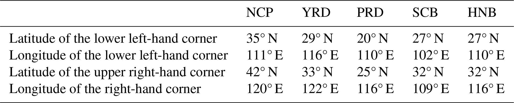 Table 1Five study areas were selected in China, as shown in Fig. 1. Each area is defined by the latitude and longitude of the lower left-hand and upper right-hand corners.