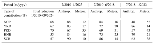 The data further show that AOD differences between the five regions have become smaller. In 2010, AOD over the five regions ranged from 0.40 (PRD) to 0.53 (YRD and HNB), whereas in 2024, AOD over the five regions ranged from 0.29 to 0.33 (see Fig. 3). However, a closer look shows that AOD did not vary in a monotonous manner and that substantial variations occurred, as revealed after low-pass filtering (CMA12). The AOD not only varied between the five different regions, but AOD variations within each region also occurred at different times (as illustrated in Fig. 3). Clearly, not only did emission reduction policies and other anthropogenic factors (economic development, urbanization, etc.) influence AOD, but meteorological factors also played a role. This is further illustrated by the analysis of anthropogenic and meteorological contributions to AOD (see de Leeuw et al., 2023; Sect. 2.4.2) applied to the C6.1 dataset. Because CESM data (available until July 2023) are used, the analysis was made for the period from January 2010 to July 2023, as well as the periods before and after 2018. Due to the CMA12 filtering, the period was reduced to July 2010 to January 2023. The results in Table 2 show that meteorological contributions vary between 12 % (NCP) and 33 % (PRD) over the whole period, whereas they are larger overall over shorter periods, between 14 % (SCB) and 31 % (PRD) for the period until 2018 (Period 1) and 14 % (YRD) to 52 % (NCP) for the period after 2018 (Period 2). The data further show that the meteorological contributions during Period 2 were substantially larger than during Period 1 over the NCP (52 % vs. 16 %), the PRD (43 % vs. 31 %), and the SCB (38 % vs. 14 %), whereas they were smaller over the YRD (14 % vs. 28 %) and HNB (21 % vs. 25 %). In view of the large AOD increase between mid-2018 and January 2021 over the YRD and HNB (Fig. 3), the smaller meteorological contributions in Period 2 compared with Period 1 may be surprising; however, the data in Fig. 3 also show the much higher AOD over these areas during extended periods in 2011 and 2014, with clear meteorological influences for the YRD (as shown in Fig. 7) and for HNB (Fig. 11), which may have resulted in relatively large meteorological contributions during Period 1. When we isolate the period mid-2018 to January 2021, we find that the meteorological contributions were 33 % over the YRD and 32 % over HNB.