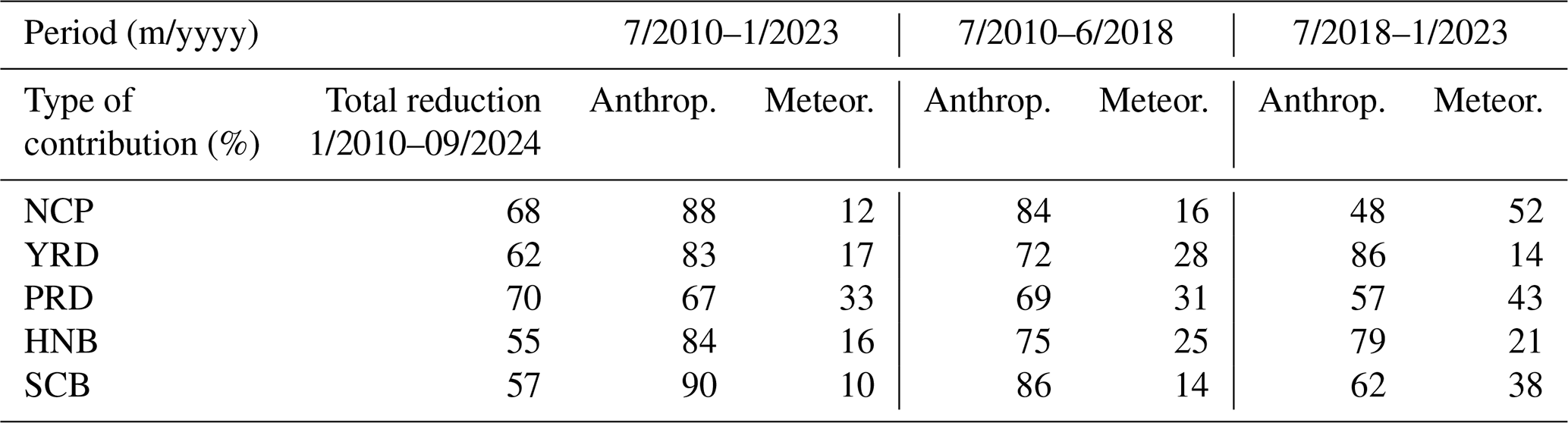 As mentioned above, the concentrations of aerosols are influenced by both meteorological and anthropogenic effects, including emission reduction policies, as shown by work such as Kang et al. (2019). Using methods similar to those of Kang et al. (2019), de Leeuw et al. (2023) showed that meteorological effects were responsible for as much as one-quarter of the total reduction in AOD over the Yangtze River Delta (YRD) between July 2011 and February 2020. The total reduction amounted to 31.4 %, due to contributions from meteorological and anthropogenic effects, resulting in an AOD smaller than that in 2000. Over the North China Plain (NCP) the total reduction was 27.2 %, with 6 % attributed to meteorological effects, while the total reduction values were 22.2 %, 35.9 %, and 40.3 % over the Pearl River Delta (PRD), Hunan and Hubei (HNB), and the Sichuan Basin (SCB), respectively, with 22 %, 10 %, and 17 % of the total corresponding reduction attributed to meteorological effects.