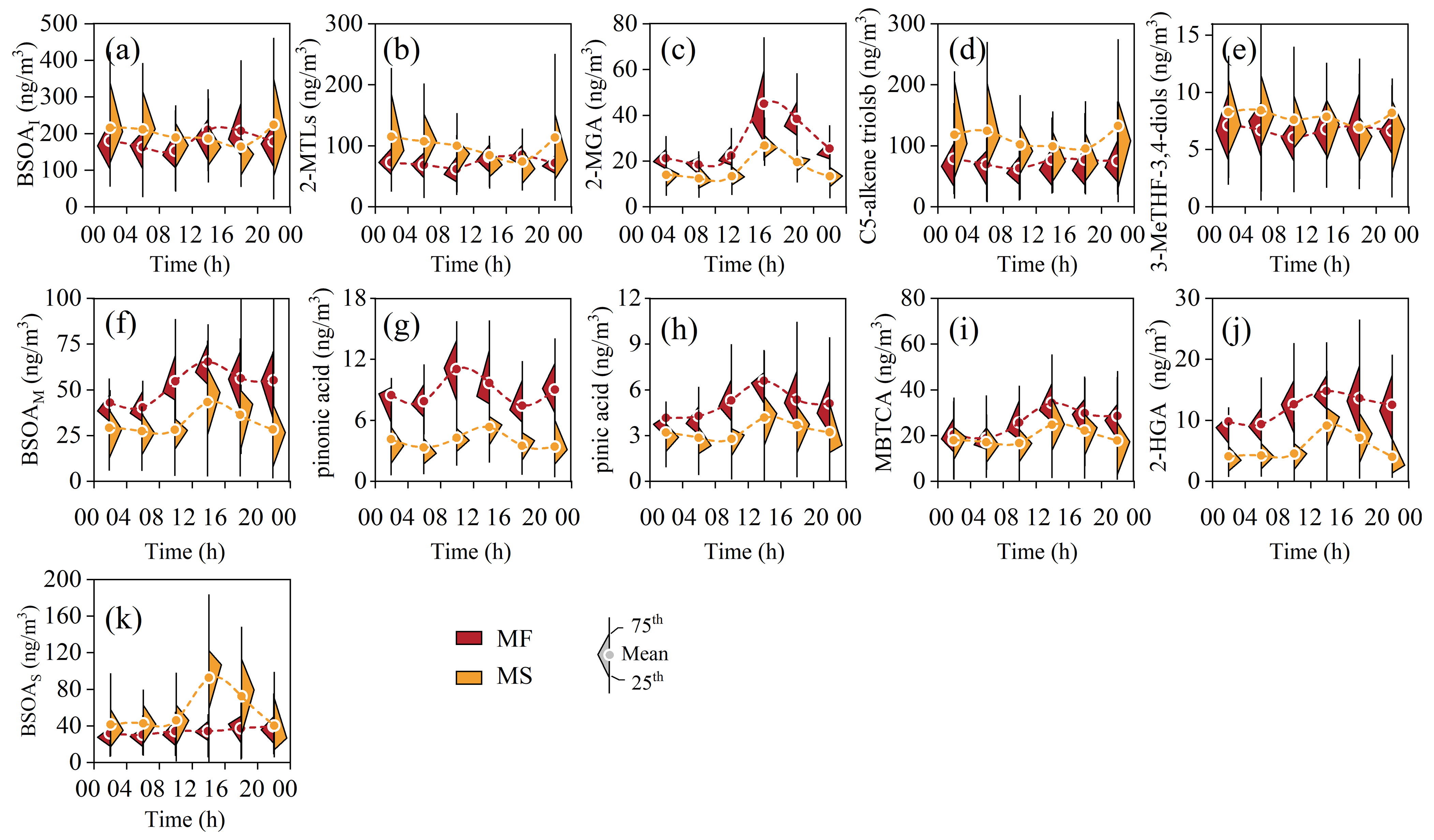 Figure 2Diurnal variations in BSOA tracers between the two sites. (a–e) Isoprene-derived SOA tracer, (f–j) monoterpene-derived SOA tracer, and (k) β-caryophyllene-derived SOA tracer.