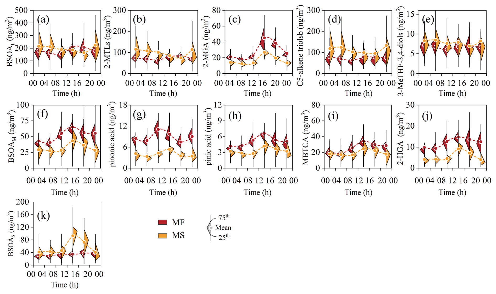 2-Methyltetrols (2-MTLs), as the predominant species at both sites, were more abundant aloft () relative to the surface site (). The levels were comparable to the field measurements at Mt. Tai (98 ng m−3) (Yi et al., 2021), Mt. Changbai (22–282 ng m−3) (Wang et al., 2008), and Mexico City (8–190 ng m−3) (Cooke et al., 2024a). Recently, a forest observation demonstrated that 2-MTLs could be biologically produced and then directly emitted into the atmosphere (Ye et al., 2021), whereas there is no significant correlation between 2-MTLs and C29-alkane mainly released by vegetation (Fig. S4b), indicating that 2-MTLs at both sampling sites primarily derived from secondary formation rather than being directly emitted by vegetation. As the oxidation products of isoprene under low/free-NOx conditions, 2-MTLs at the MF site were significantly formed during the daytime and peaked at 12:00–16:00 LT (local time, 85 ng m−3, Fig. 2b), corresponding to the period of reduced NOx loads, high temperature, and intense solar radiation. Conversely, the concentration of 2-MTLs aloft decreased progressively during the daytime, bottoming out at 16:00–20:00 LT. This inverse diurnal pattern was probably due to the influx of the surface NOx that was transported aloft by the prevailing valley breeze, which subsequently inhibited the 2-MTL formation aloft. Meanwhile, such relatively abundant NOx conditions during the daytime promoted the formation of 2-MGA aloft (culminating at 12:00–16:00 LT), as corroborated by a positive correlation between 2-MGA and NO2 (Fig. S5c). This finding was consistent with the laboratory measurements of 2-MGA derived from oxidization of isoprene with a high NOx load (Surratt et al., 2006; Szmigielski et al., 2007). Moreover, the surface 2-MGA also exhibited a similar diurnal pattern with an average of , being 1.8-fold that aloft, despite a weak relationship between 2-MGA and NO2. This appreciably suggested that, beyond NOx, other factors also drove the 2-MGA formation at the MF site.