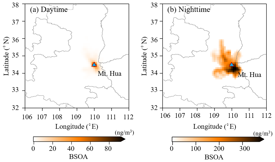 To identify the potential spatial sources of the high BSOA on Mt. Hua, a CWT analysis was conducted using the BSOA concentrations and air mass backward trajectories. The 12 h backward trajectories at a height of 1100 m were calculated by the Hybrid Single-Particle Lagrangian Integrated Trajectory (HYSPLIT) model on an hourly basis throughout the campaign. Due to the relatively low temporal resolution of filter samples, the averaged BSOA concentration was assigned to match all the trajectories corresponding to each sample. And the CWT analysis herein was subsequently performed using an Igor-based tool (i.e., ZeFir v3.70); more details for the protocol can be found in Petit et al. (2017). Briefly, a grid with 0.25°×0.25° cell size was created to cover all the trajectories. Each grid cell was assigned a weighted concentration, which was obtained from the averaged BSOA concentration with associated trajectories crossing the grid cell. A high value in a grid cell indicates that the air parcels passing through it were associated with a high concentration at the receptor site.