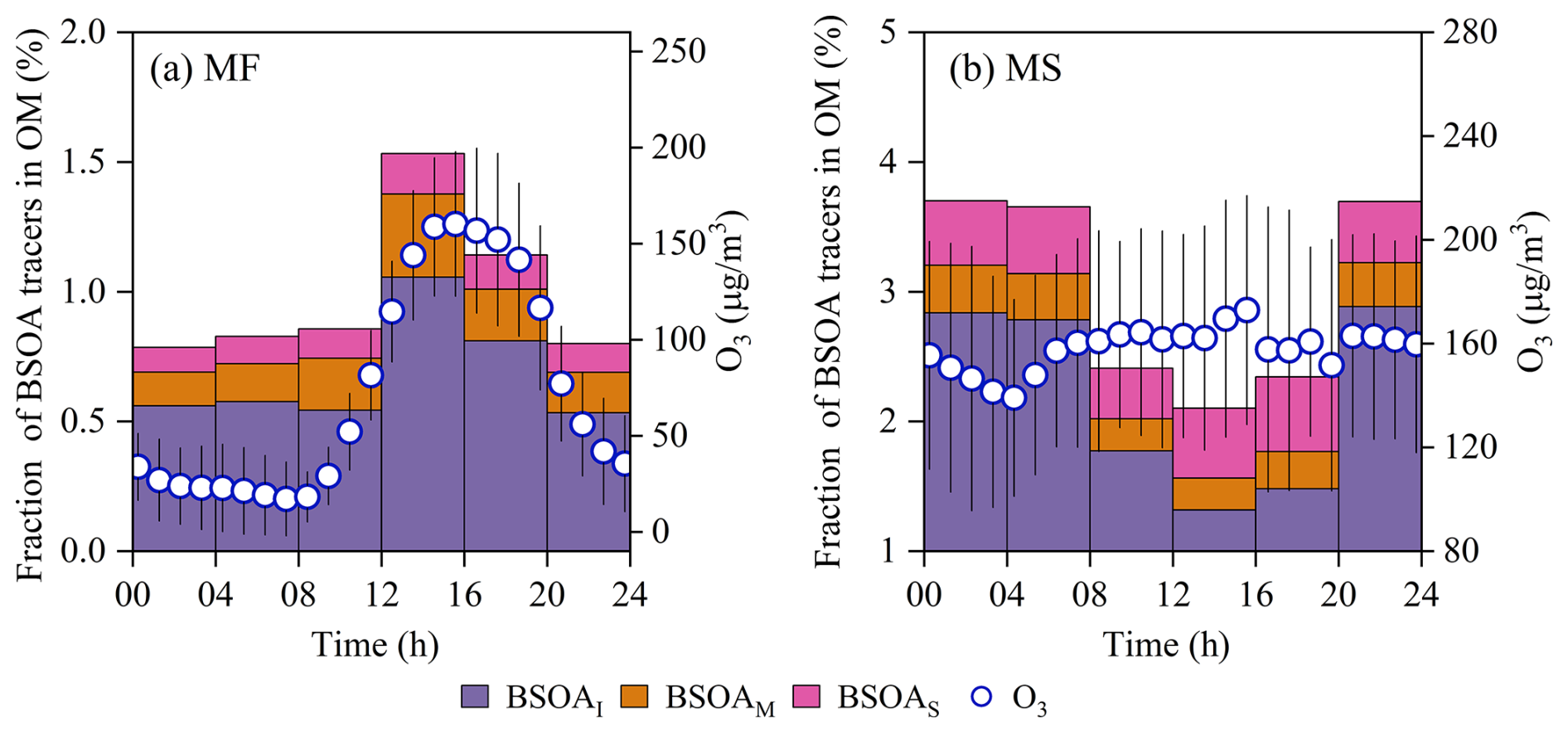 During the campaign, MBTCA was the most abundant BSOAM tracer, explaining more than half of the surface BSOAM tracers at both sites, followed by 3-HGA with fractional contributions of ∼20 % to total BSOAM. MBTCA and 3-HGA are regarded as the later-generation products of α- and β-pinene and can be derived from further photodegradation of PNA or PA. Thus, the ratio (abbreviated as MP hereafter) is commonly used to estimate the α- and β-pinene-derived SOA aging, a higher value of which is indicative of more aged α- and β-pinene SOA. As depicted in Fig. S6, the MP value (2.6±1.3) at the MS site was ∼1.4-fold that at the MF site, reflecting the fact that the BSOAM tracers aloft were more aged compared to that at surface. This finding coincided with the variation of the oxidation state of carbon (OSc) measured by the aerosol mass spectrometer. Additionally, a clear diurnal pattern of MP ratio was found at the MF site, with a daily peak at 16:00–20:00 LT that lagged that of MBTCA by ∼4 h. However, the diurnal cycle of the MP ratio at the MS site exhibited a bimodal pattern, with two nearly equivalent peaks during the daytime (16:00–20:00) and nighttime (04:00–08:00). Relatively high MP ratios during nighttime indicated a more aged state of nocturnal α- and β-pinene SOA at the upper atmosphere, markedly differing from the ground-based observations. This was partially due to the fact that the nocturnal pollutants at the MS site were mostly driven by regional or long-range transport (Fig. 3), in which α- and β-pinene SOA aloft would undergo deeper aging, leading to the high MP ratio.