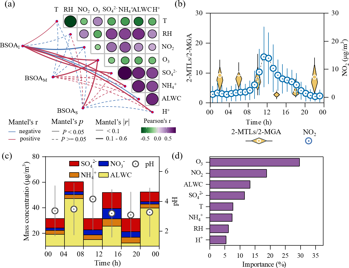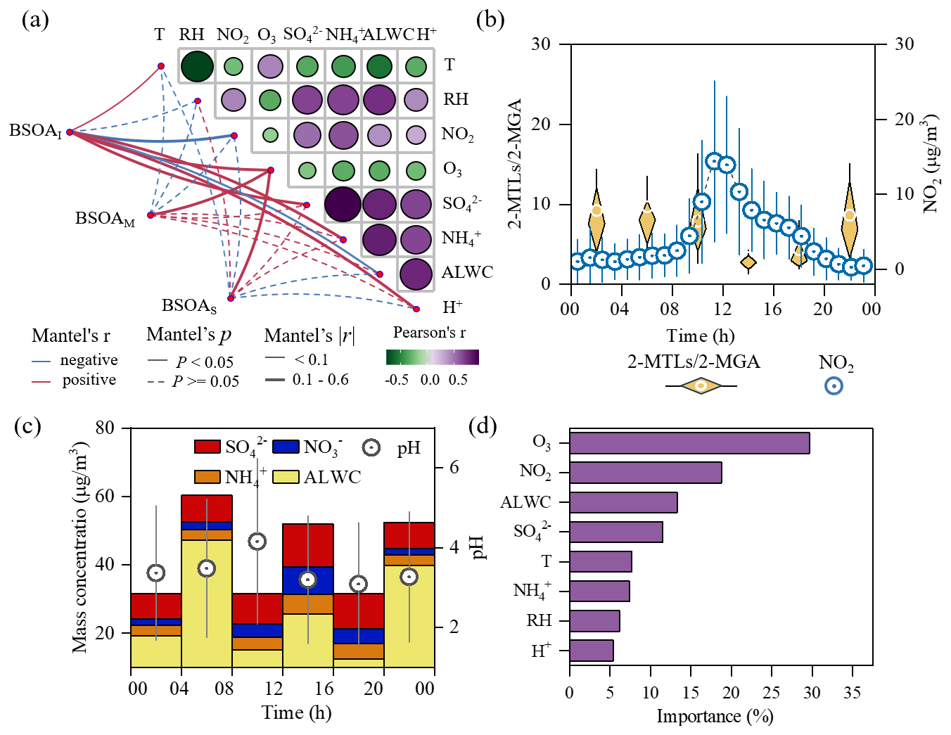 Figure 5Formation of daytime isoprene-derived SOA in the upper troposphere. (a) Mantel test between BSOA tracers and potential influencing factors at the MS site. (b, c) Diurnal variations of the 2-MTL 2-MGA ratio, pH, and the concentration of NO2, SNA, and ALWC at the MS site. (d) Importance assessment for the key factors affecting the daytime isoprene-derived SOA at the MS site.