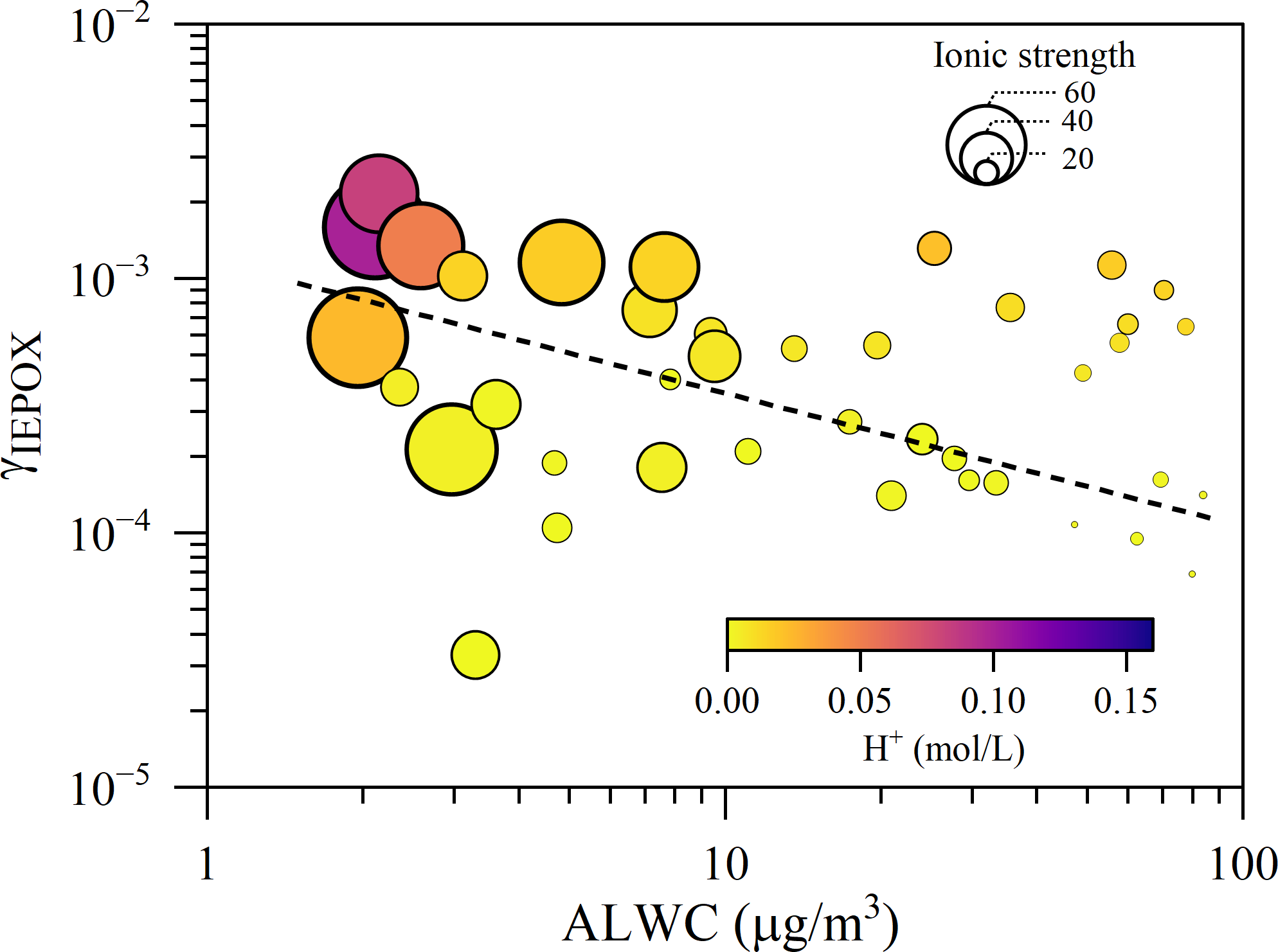 Furthermore, the additional sulfate formation in a lifting air mass can also promote an enhancement in ALWC aloft, consistent with the strong positive correlation observed between ALWC and sulfate (R2=0.66, P<0.05, Fig. S7). As demonstrated in Fig. 5c, the daytime ALWC peaked at 12:00–16:00 LT, corresponding to a significant decrease in . This pattern suggested an inhibited effect of aerosol water on BSOA formation, consistent with laboratory observation by Gaston et al. (2014), who found a 50 % reduction in IEPOX reactive uptake on NH4HSO4 particles as RH increases from 30 %–70 %. As evidenced by previous studies (Xu et al., 2015; Riedel et al., 2015), abundant aerosol water can moderate BSOA formation by affecting ionic strength and proton donor/nucleophilic activity, consequently altering the reactive uptake (e.g., IEPOX) and subsequent reactions. To quantitatively evaluate the effects of ALWC, the pseudo-first-order heterogeneous reaction rate constant for IEPOX reactive uptake (khet) was calculated for the samples at the MS site following the method of Gaston et al. (2014) (Sect. S2). The simulated uptake coefficient of IEPOX (γIEPOX) during the daytime was , being in the range of field and laboratory observations () (Zhang et al., 2017; Gaston et al., 2014). As shown in Fig. 6, high ALWC commonly corresponds to low γIEPOX during the daytime, characterized by weak ionic strength and low concentration. This indicates that enhanced ALWC at MS likely impeded the IEPOX uptake onto a particle surface. Consequently, the average khet at 12:00–16:00 LT was merely , which was an order of magnitude lower than that in the rest of daytime. These results underscore the fact that enhanced ALWC during the daytime led to an insufficiently rapid heterogeneous reaction of IEPOX and finally diminished the BSOAI formation.