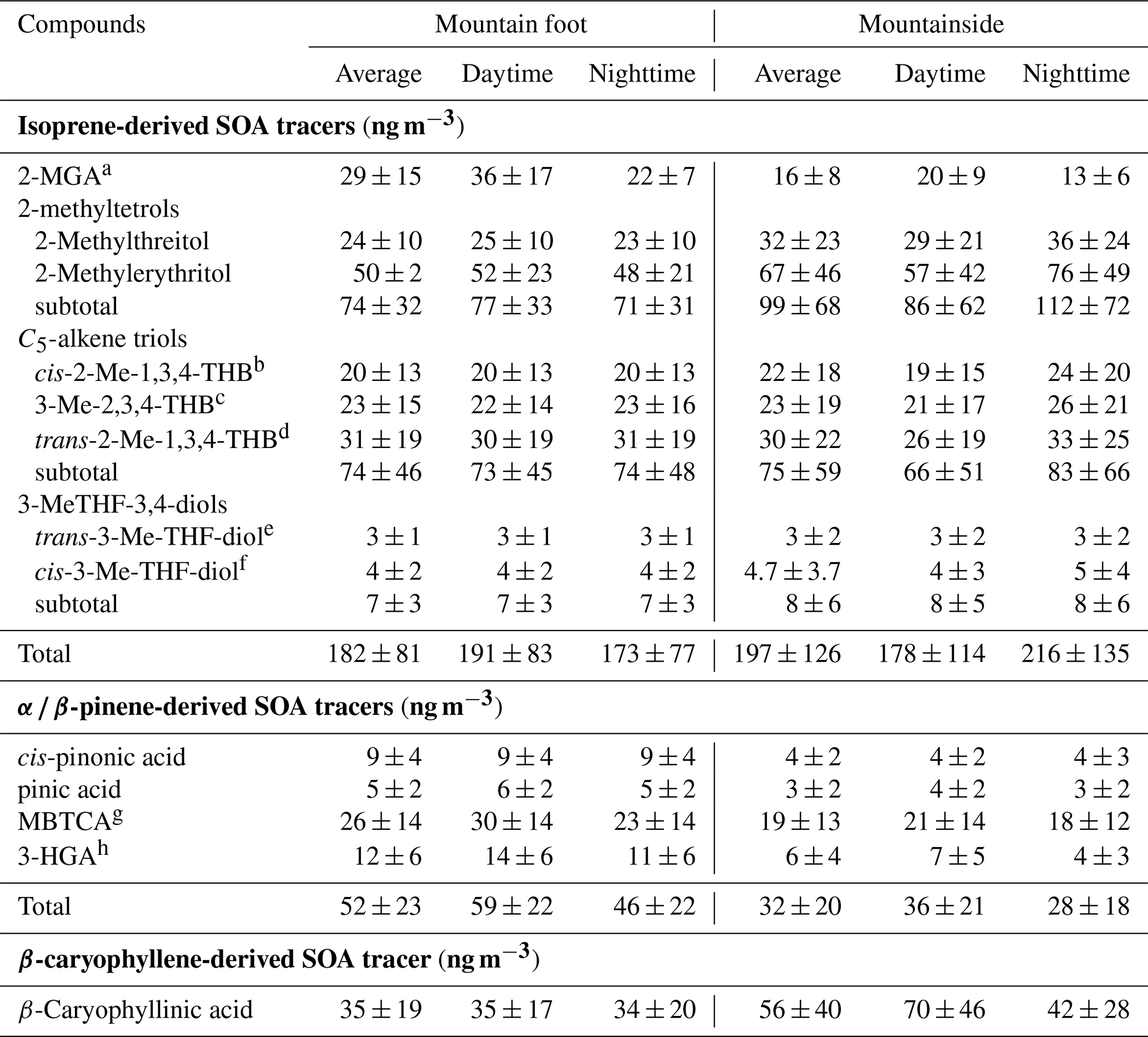 Table 1Summary of the average BSOA tracers at the two sampling sites during the whole campaign.