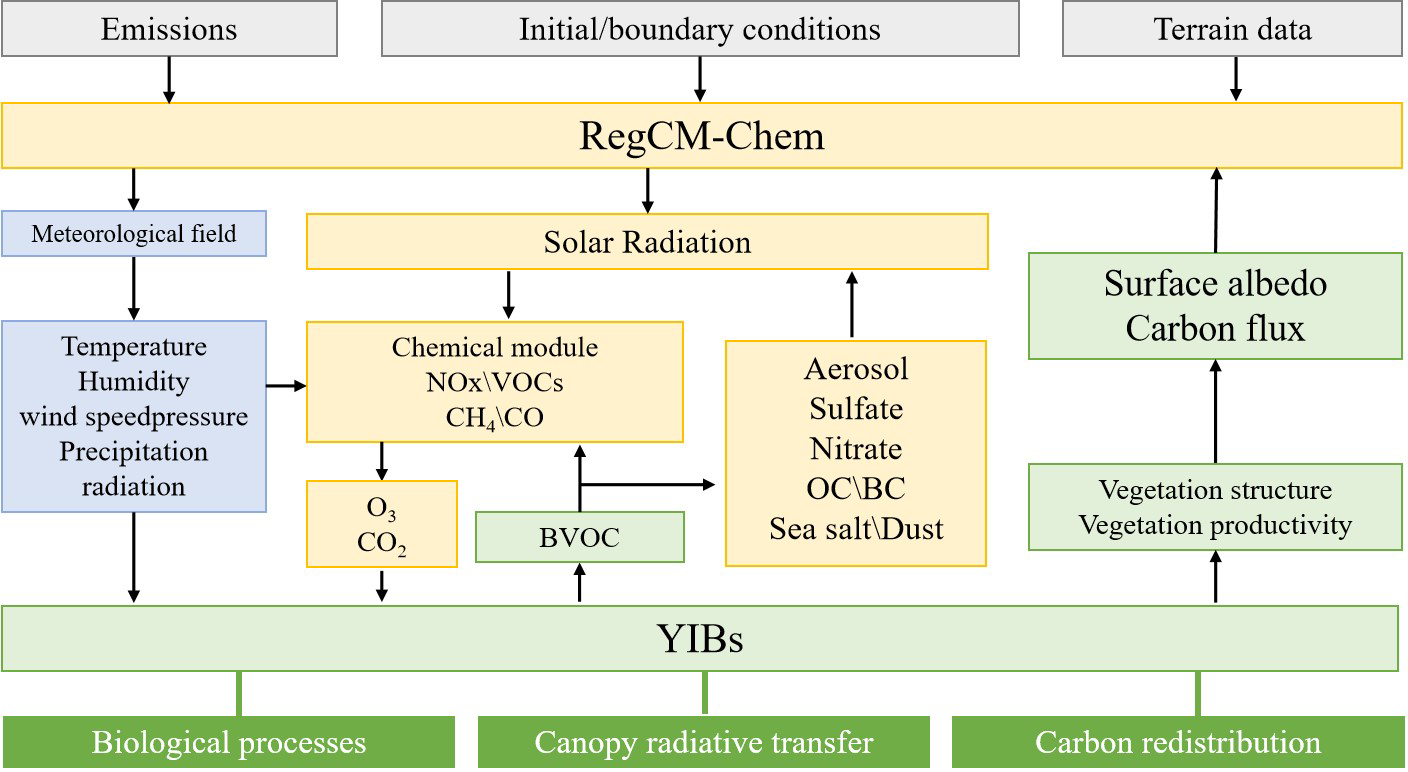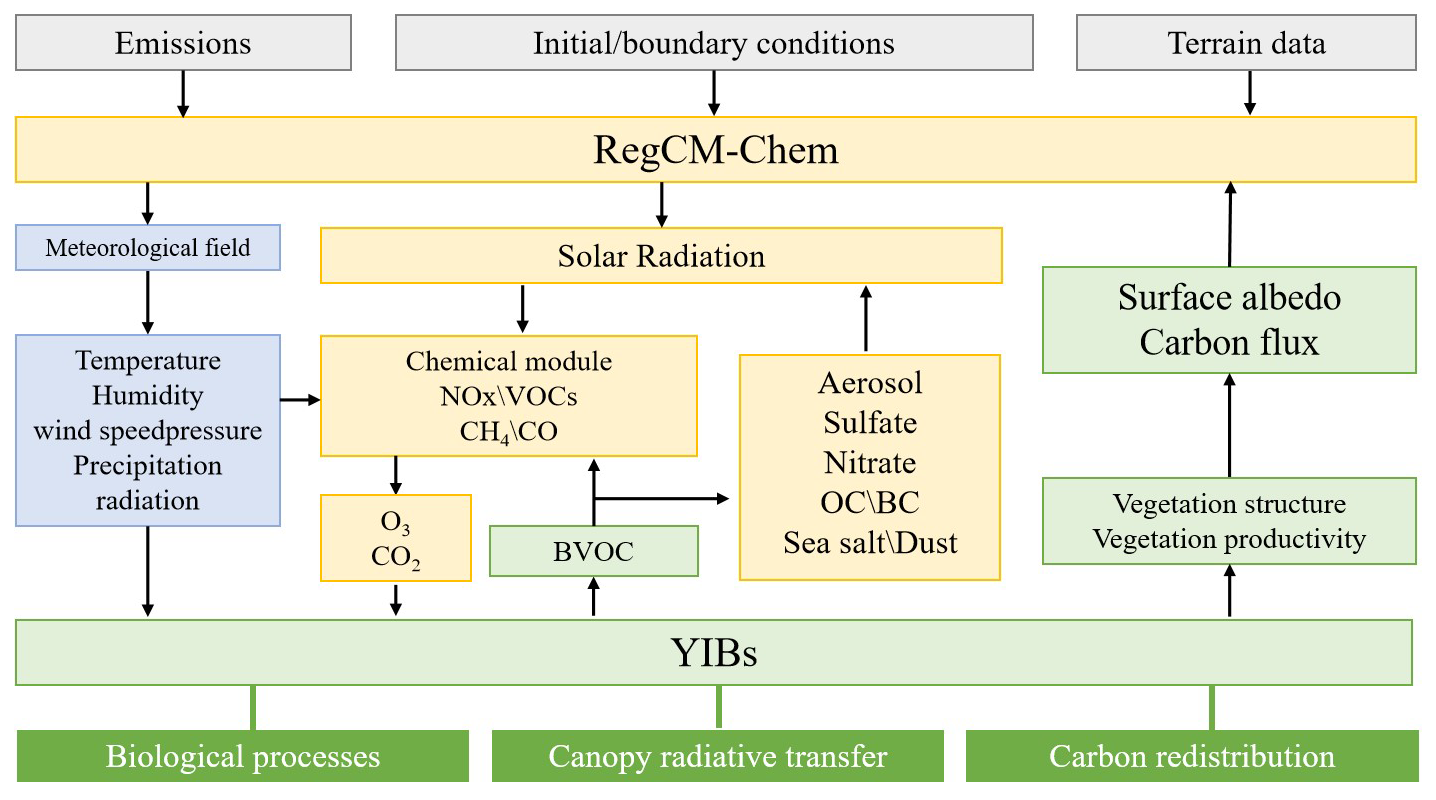 In this study, we employed the coupled regional climate-chemistry-ecology model RegCM-Chem-YIBs (Xie et al., 2019, 2024). The RegCM-Chem component simulates key meteorological variables, including temperature, humidity, precipitation, and radiation, along with atmospheric pollutants including ozone and particulate matter (Shalaby et al., 2012). The YIBs (Yale Interactive terrestrial Biosphere) model focuses on simulating vegetation physiological processes, such as ozone-induced damage, photosynthesis, and respiration (Lei et al., 2020). Additionally, it computes important land surface parameters, including CO2 flux, BVOC emissions, and stomatal conductance (Yue and Unger, 2015). The YIBs model employs a leaf-level BVOC emission scheme based on vegetation photosynthesis. Unlike the traditional MEGAN (Model of Emissions of Gases and Aerosols from Nature) model, this approach incorporates the influence of plant photosynthesis on BVOC emissions, making it more representative of actual plant physiological processes. In this scheme, leaf-level BVOC emission rates depend on the photosynthetic rate, leaf surface temperature, and intracellular CO2 concentration (Yue and Unger, 2015; Lei et al., 2020; Yue et al., 2015).
