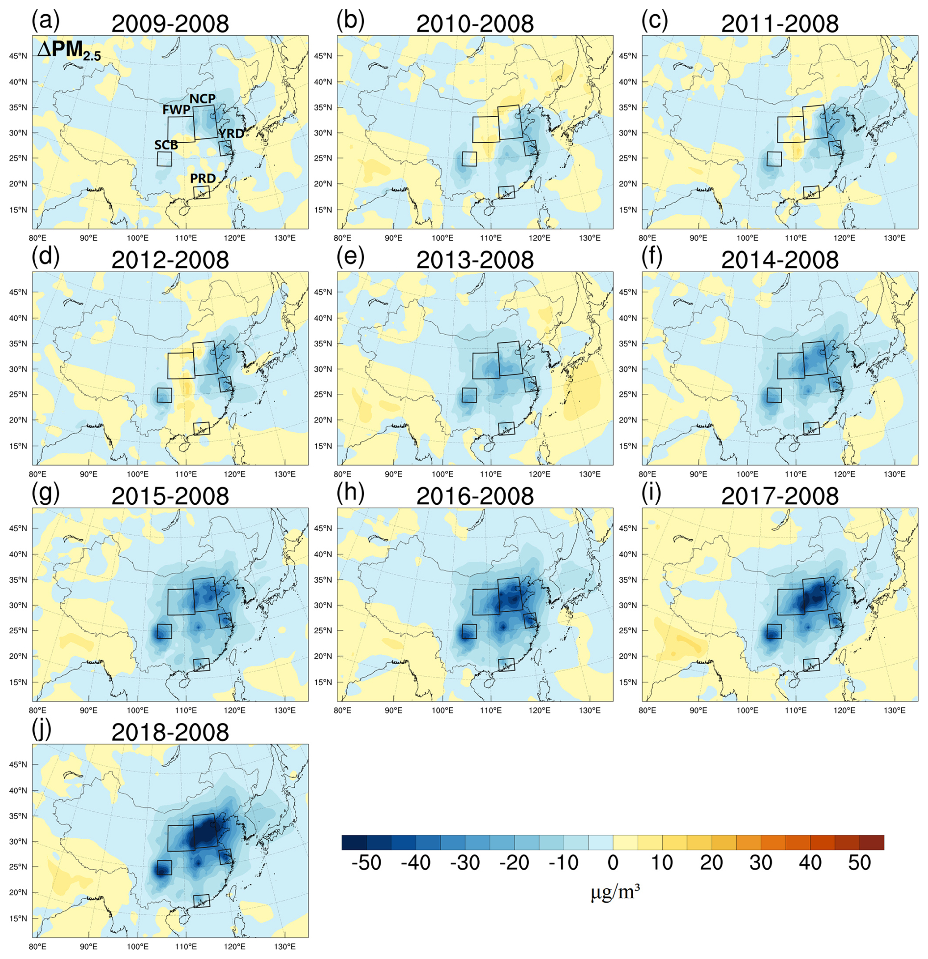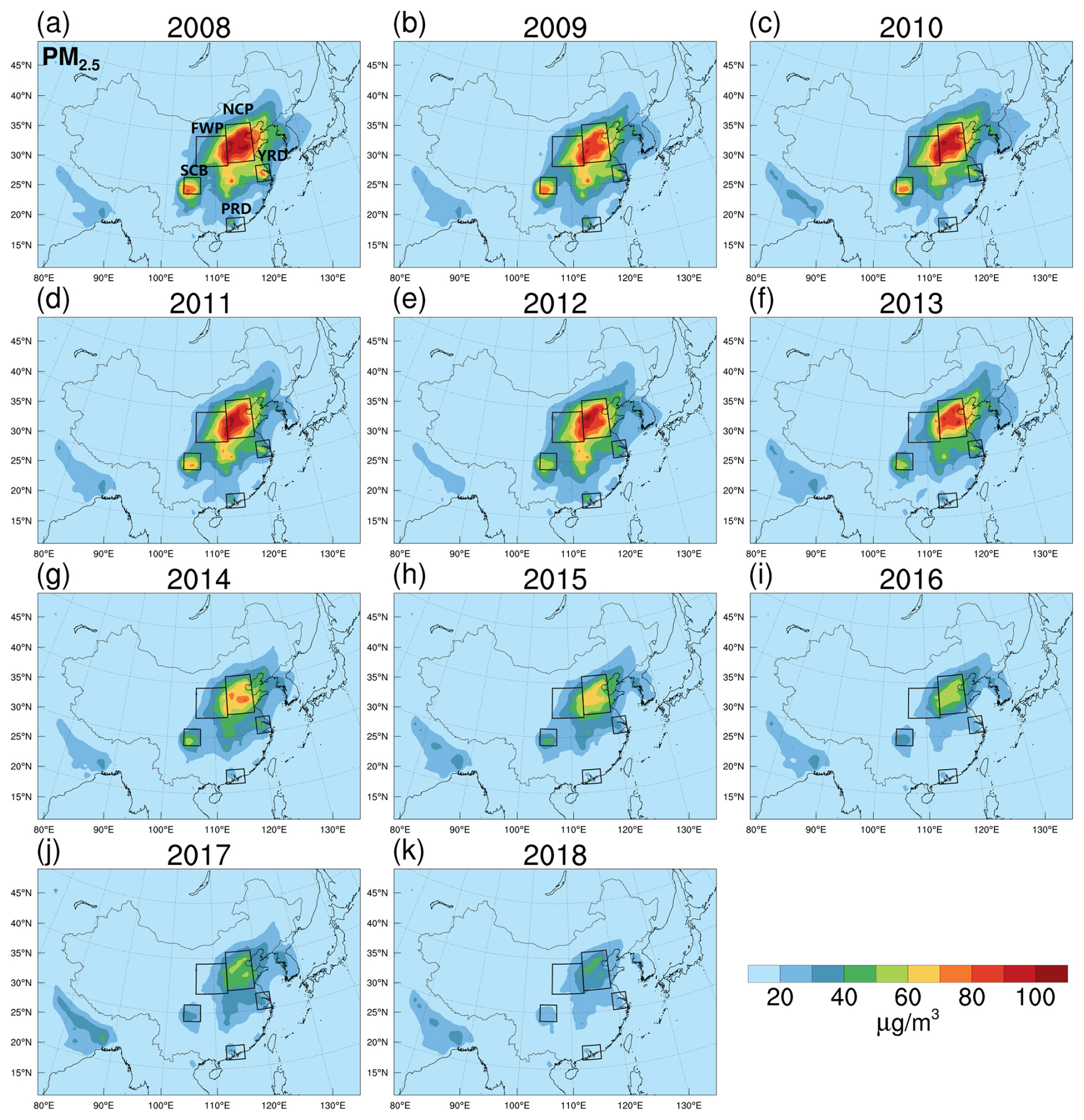 Figure 2Near-surface PM2.5 concentrations (µg m−3) over East Asia during the EASM period from 2009 (a) to 2018 (k) (SIM2008). Key regions are highlighted by black boxes, including the North China Plain (NCP), Fenwei Plain (FWP), Yangtze River Delta (YRD), Pearl River Delta (PRD), and Sichuan Basin (SCB).