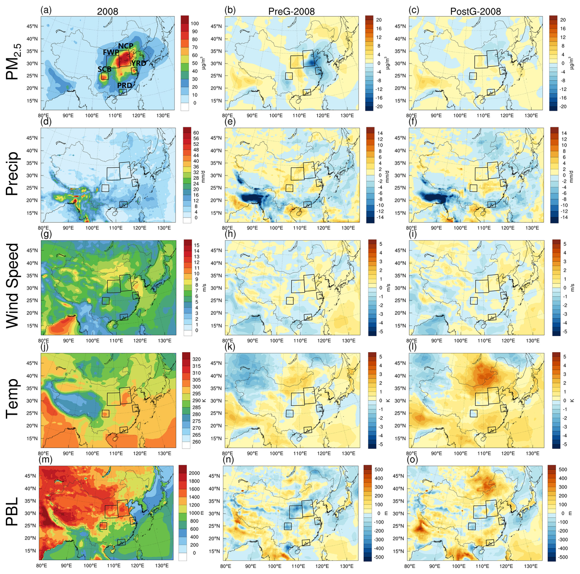 Figure 4The PM2.5 (a–c, µg m−3), precipitation (d–f, mm d−1), wind speed (g–i, m s−1), temperature (j–l, K), and planetary boundary layer (PBL) height (m–o, m) during the EASM period in 2008 (left), and their mean changes due to meteorological variations in the PreG (2009–2013, center) and PostG (2014–2018, right) periods relative to 2008. PreG-2008 and PostG-2008 represent the average annual differences between experiments SIMBase and SIMMET=2008 (SIM) for the periods 2009–2013 and 2014–2018, respectively.