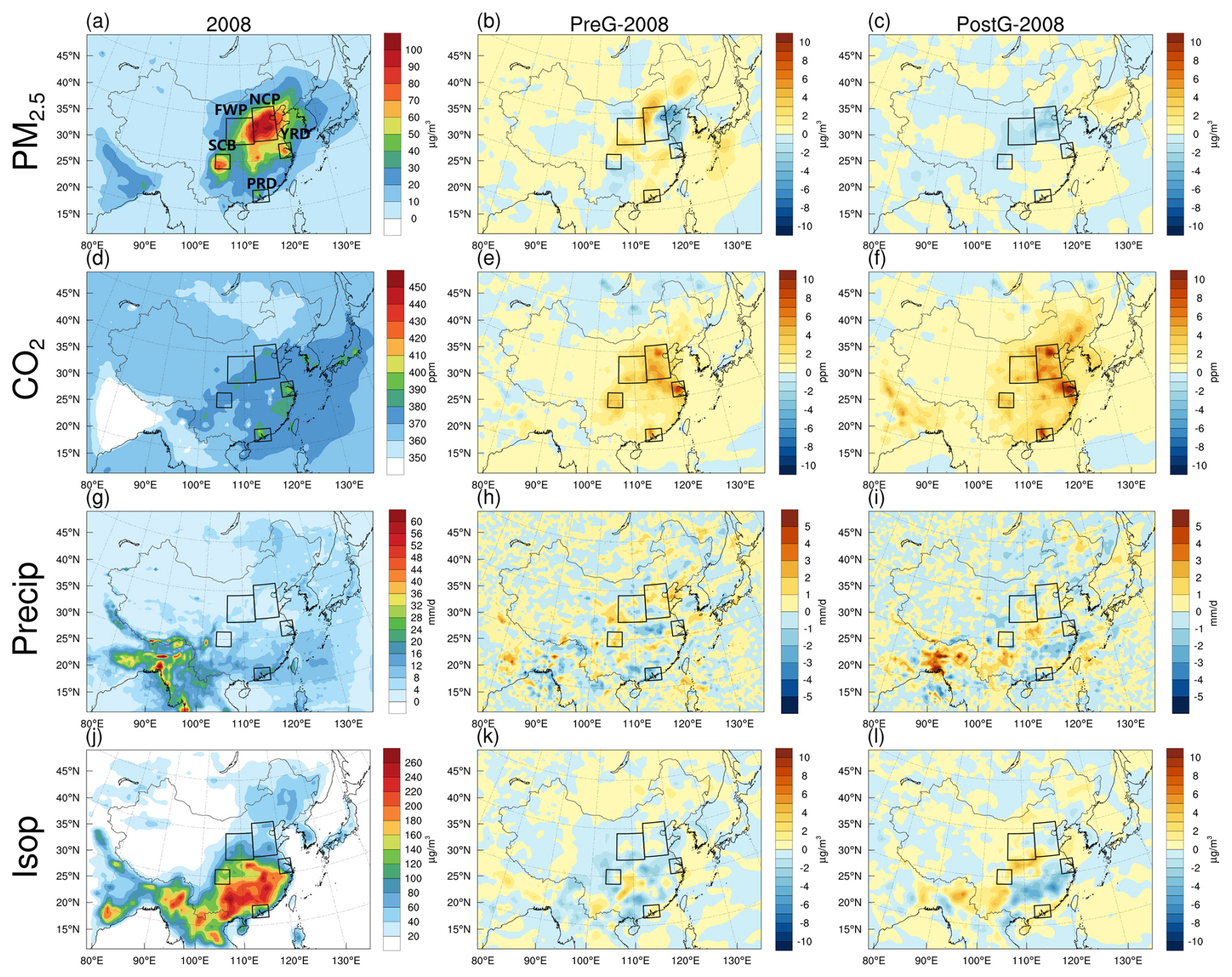 Figure 5The PM2.5 (a–c, µg m−3), CO2 (d–f, ppm), precipitation (g–i, mm d−1), and isoprene (j–l, µg m−3) during the EASM period in 2008 (left) and their mean changes due to CO2 emission variations in the PreG (2009–2013, center) and PostG (2014–2018, right) periods relative to 2008. PreG-2008 and PostG-2008 represent the average annual differences between experiments SIMBase and SIM (SIM) for the periods 2009–2013 and 2014–2018, respectively.