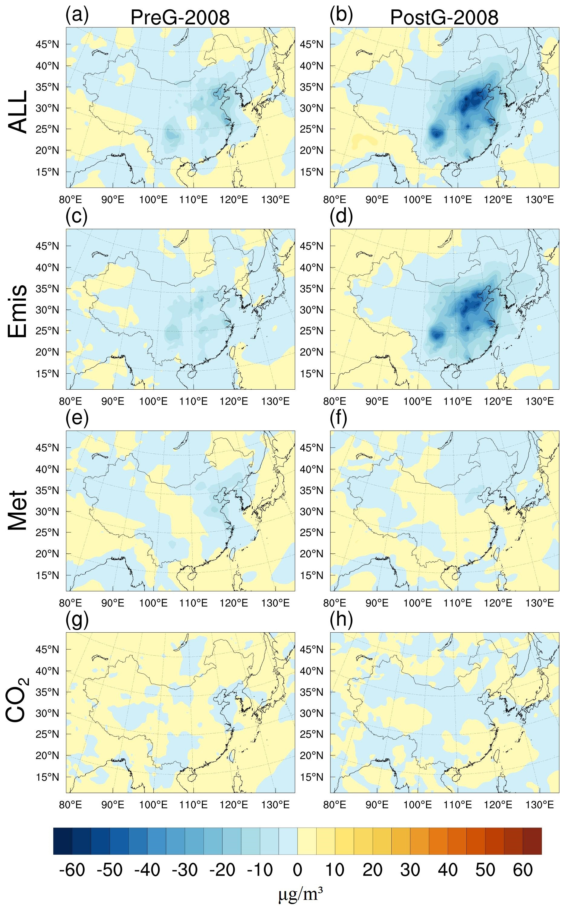 Table 6Changes in total PM2.5 concentrations (ALL, SIMBase−SIM2008) and the impacts of anthropogenic pollutant emissions (Emis, All-Met-CO2), meteorological conditions (Met, SIM), and CO2 emission (CO2, SIM) variations on PM2.5 concentrations (µg m−3) during the EASM period in the PreG (2009–2013) and PostG (2014–2018) periods relative to 2008.