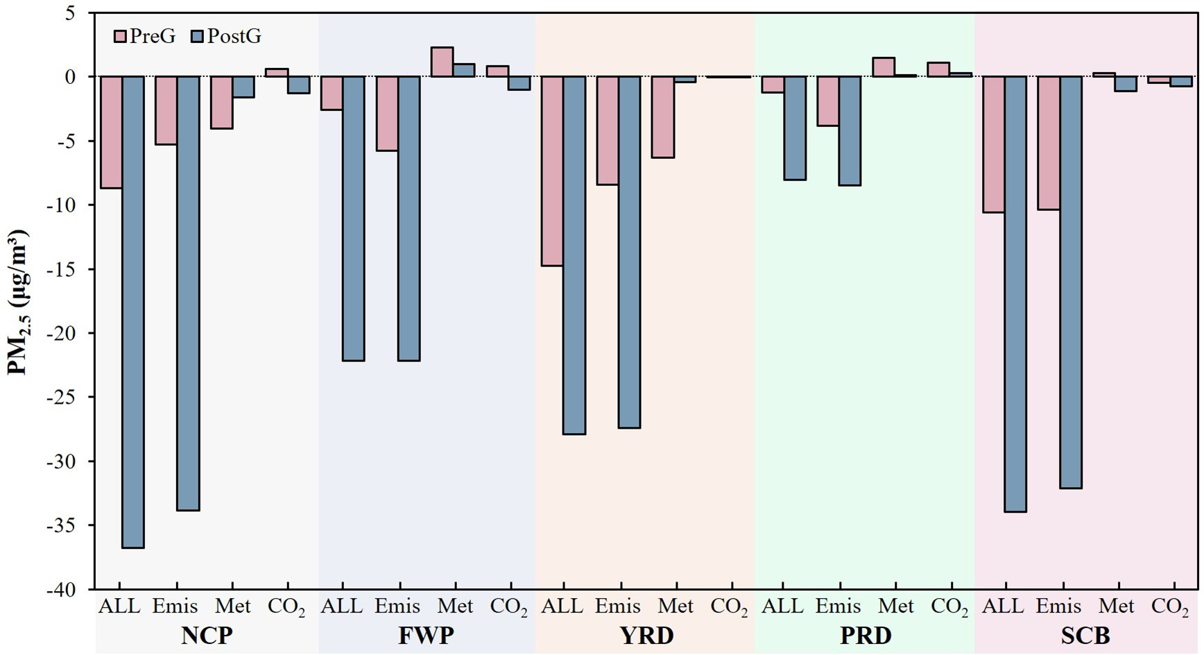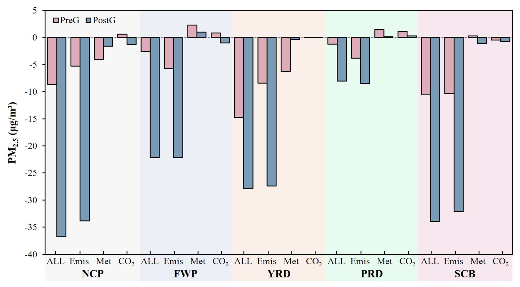 In the SCB region, the basin topography results in relatively minor effects of meteorological conditions and CO2 emission changes on PM2.5 levels, with contributions ranging from −1.14 to 0.29 µg m−3 during both the PreG and PostG periods. In contrast, anthropogenic pollutant emissions are the primary drivers of reduced PM2.5 concentrations, exerting an impact of −32.09 µg m−3 during the PostG period.