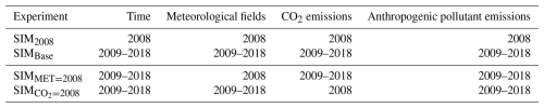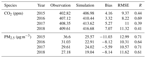 Anthropogenic pollutant emissions data were obtained from the Multi-resolution Emission Inventory for China (MEIC v1.4) developed by Tsinghua University (Geng et al., 2024). Surface CO2 flux data were sourced from the National Oceanic and Atmospheric Administration (NOAA) CarbonTracker CT2019 dataset, which includes contributions from fossil fuel combustion, biomass burning, and ocean–atmosphere CO2 exchange (Peters et al., 2007). Meteorological fields were derived from ERA-Interim reanalysis (Balsamo et al., 2015), while sea surface temperature data were taken from NOAA's weekly mean dataset (Huang et al., 2021). The model employed the Grell cumulus parameterization scheme, the CCM3 radiation scheme, the Holtslag PBL scheme for boundary layers, the CBM-Z mechanism for meteorology and chemistry, and the TUV photochemistry scheme.