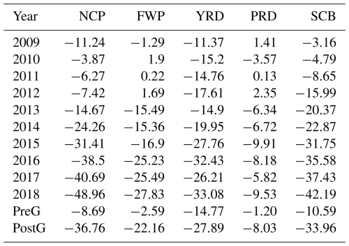 Figure 3 and Table 3 present the changes in PM2.5 concentrations relative to 2008 across East Asia from 2009 to 2018. Since 2008, most regions in China have seen varying degrees of PM2.5 reduction. During the pre-governance (PreG) period (2009–2013), the largest decrease occurred in the YRD, with a reduction of 14.77 µg m−3, followed by the SCB and PRD, where concentrations dropped by 10.59 and 8.69 µg m−3, respectively. In contrast, the Fenwei Plain (FWP) and PRD experienced smaller changes, with reductions of less than 3 µg m−3. PM2.5 concentrations across China significantly decreased after the implementation of the Clean Air Action Plan in 2013. The most notable reductions were simulated in the North China Plain and SCB, where PM2.5 concentrations dropped by 36.76 and 33.96 µg m−3, respectively. In the FWP and YRD, PM2.5 concentrations decreased by 22.16 to 27.89 µg m−3. In contrast, the PRD saw a smaller reduction, with levels decreasing by just 8.03 µg m−3. This may be attributed to the region's significant influence from the summer monsoon and relatively lower impact from anthropogenic pollutant emissions. Further analysis of these factors will be conducted in subsequent sections.