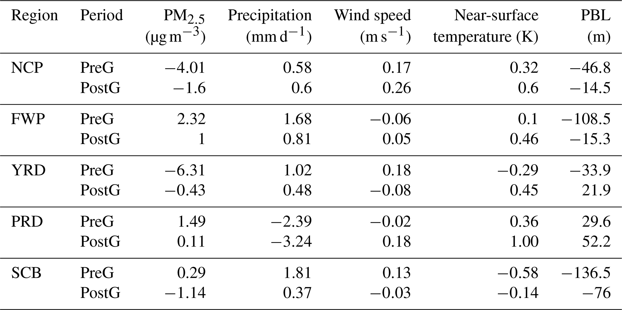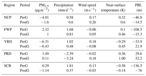 Table 4 indicates that in the North China Plain (NCP) region precipitation increased by 0.58 to 0.6 mm d−1 and wind speed rose by 0.17 to 0.26 m s−1 during the PreG and PostG periods, resulting in a decrease in near-surface PM2.5 concentrations of 1.6 to 4.01 µg m−3. In the FWP region, PM2.5 concentrations increased by 1 to 2.31 µg m−3, which was associated with a rise in temperature of 0.1 to 0.46 K and a significant decrease in PBLH of 108.5 to 15.3 m. In the YRD region, the increase in wind speed of 0.48 to 1.02 m s−1 facilitated a reduction in PM2.5 concentrations by 0.43 to 0.61 µg m−3. Conversely, in the PRD region, reduced precipitation combined with increased temperature contributed to an increase in PM2.5 concentrations, ranging from 0.11 to 1.49 µg m−3. In the SCB region, PM2.5 concentrations rose by 0.29 µg m−3 during the PreG period, which can be linked to a significant decrease in PBLH of 136.5 m. In the PostG period, PM2.5 concentrations decreased by 1.14 µg m−3, which can be attributed to an increase in precipitation (0.37 mm d−1) and a decrease in temperature (0.14 K).