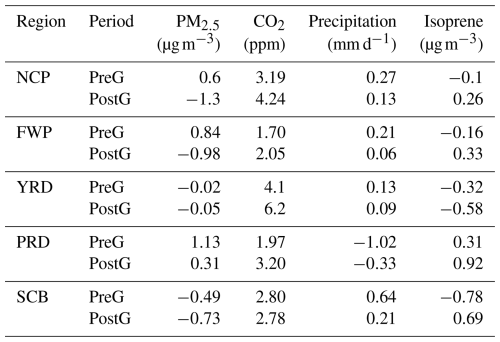 Table 5Impact of CO2 emission changes on PM2.5 (µg m−3), CO2 (ppm), precipitation (mm d−1), and isoprene (µg m−3) during the EASM period in the PreG (2009–2013) and PostG (2014–2018) periods relative to 2008. PreG and PostG represent the average annual differences between experiments SIMBase and SIM (SIM) for the periods 2009–2013 and 2014–2018, respectively.