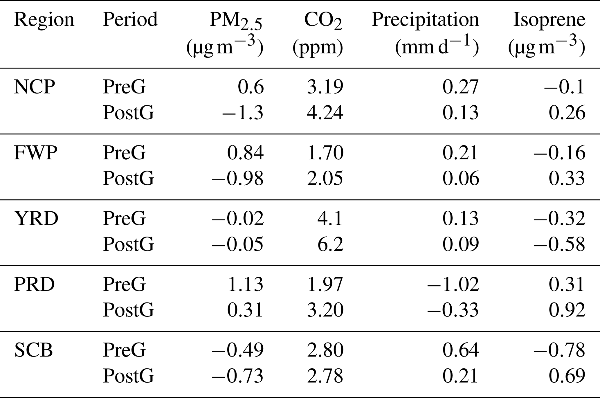 Table 5 presents a detailed analysis of the five target regions. In northern China, particularly the NCP and FWP regions, limited vegetation coverage means CO2 impacts surface PM2.5 concentrations mainly through precipitation changes. In the PostG period, precipitation increased by 0.06–0.13 mm d−1, lowering PM2.5 concentrations by 0.98–1.3 µg m−3. Similarly, in the SCB, precipitation rose by 0.21–0.64 mm d−1, reducing PM2.5 concentrations by 0.49–0.73 µg m−3 in the PreG and PostG periods. However, in the YRD and PRD regions, where vegetation coverage is higher, CO2 primarily impacts PM2.5 concentrations by modulating BVOC emissions. The impact can be either positive or negative (Possell et al., 2005) depending primarily on the balance between the inhibitory effects on synthase activity and the stimulatory effects of enhanced photosynthesis (Wilkinson et al., 2009). In the YRD region, isoprene fell by 0.32–0.58 µg m−3 during both periods, while precipitation rose by 0.09–0.13 mm d−1, collectively reducing PM2.5 by 0.02–0.05 µg m−3. In the PRD region, isoprene concentrations increased significantly by 0.31–0.92 µg m−3, while precipitation decreased by 0.33–1.02 mm d−1. Consequently, PM2.5 concentrations rose by 0.31–1.13 µg m−3 during both the PreG and PostG periods.