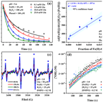 Figure 1Effect of different concentrations of Glu on the kinetics of Fenton reaction (a), apparent rate constant as a function of the fraction of Fe(II)–Glu (b), signal of EPR corresponding to DMPO-OH (the blue diamond marks the position of the characteristic 1 : 2 : 2 : 1 EPR signal of the DMPO-OH adduct) (c), and the kinetics of •OH generation in Fenton reaction in the presence of different concentrations of Glu (d). Points are determined experimentally, and lines in panels (a) and (d) are the fit of data using the kinetic model.