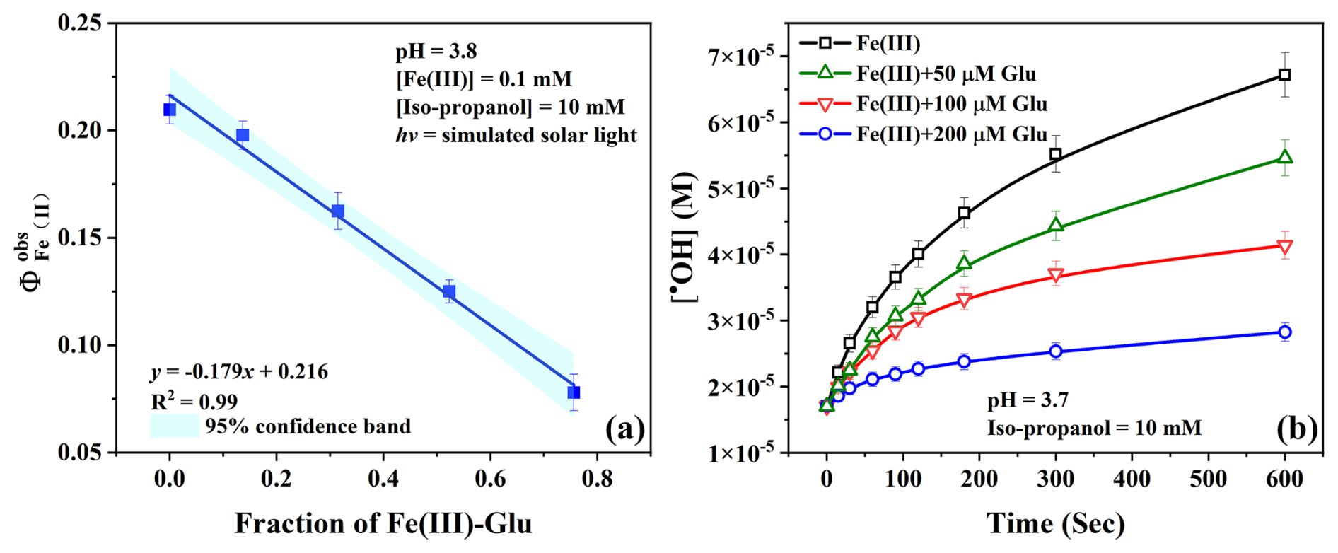 Figure 2(a) The quantum yield of Fe(III) photolysis as a function of the fraction of Fe(III)–Glu complex and (b) the •OH generation of Fe(III) photolysis in the presence of different concentrations of Glu. The continuous lines are visual guides generated by applying the “Connect B-Spline” function in Origin 2019.