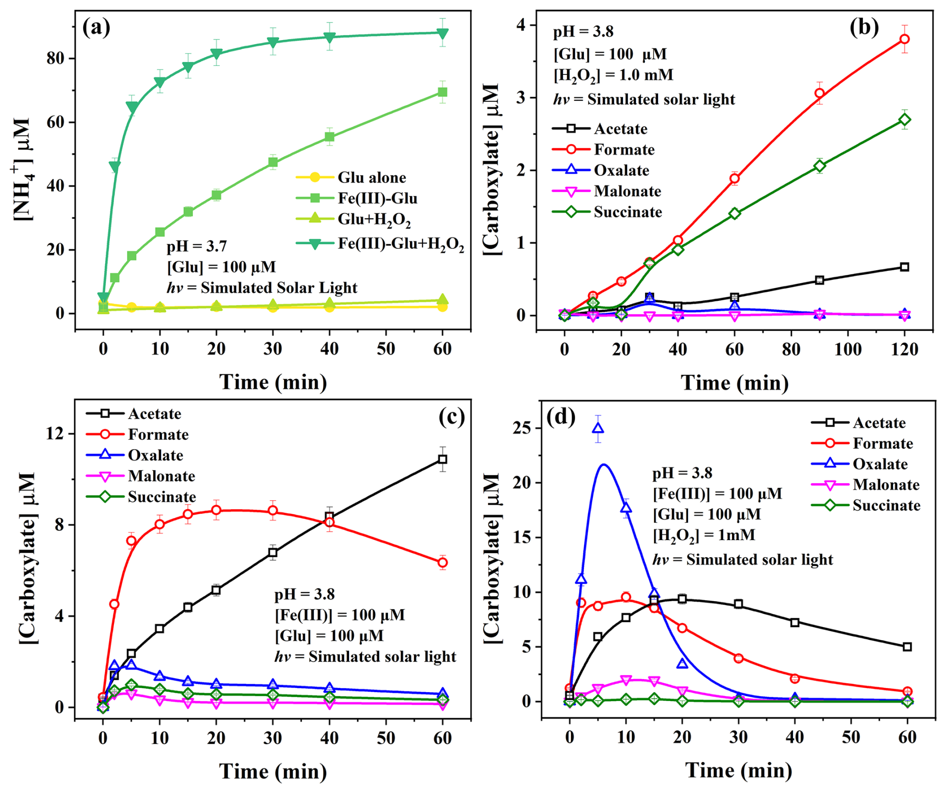 In the presence of Fe(III), NH concentration increased to 69.5 µM (Fig. 4a) within 60 min. Simultaneously, the generation of carboxyl acids, such as formate, acetate, and oxalate was observed. The concentration of formate initially increased, reaching a maximum value of 8.7 µM at 20 min, followed by a decline to about 6.4 µM at 60 min. The reason for the decline is probably due to the reaction of formate with photo-generated •OH ( = 1.3–1.4 × 108 M−1 s−1) (Buxton et al., 1988). Acetate concentration steadily increased throughout the reaction, reaching 10.9 µM at 60 min. Other carboxylates, such as succinate, malonate, and oxalate, were found in lower concentration, with a maximum of around 2 µM within 5 min. As mentioned above, in the presence of Fe(III), the Glu degradation can be attributed to two pathways: one resulting from •OH attack and the other from the photolysis of the Fe(III)–Glu complexes.