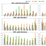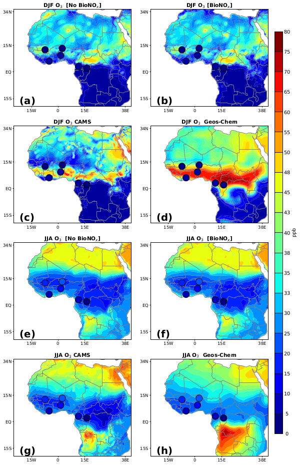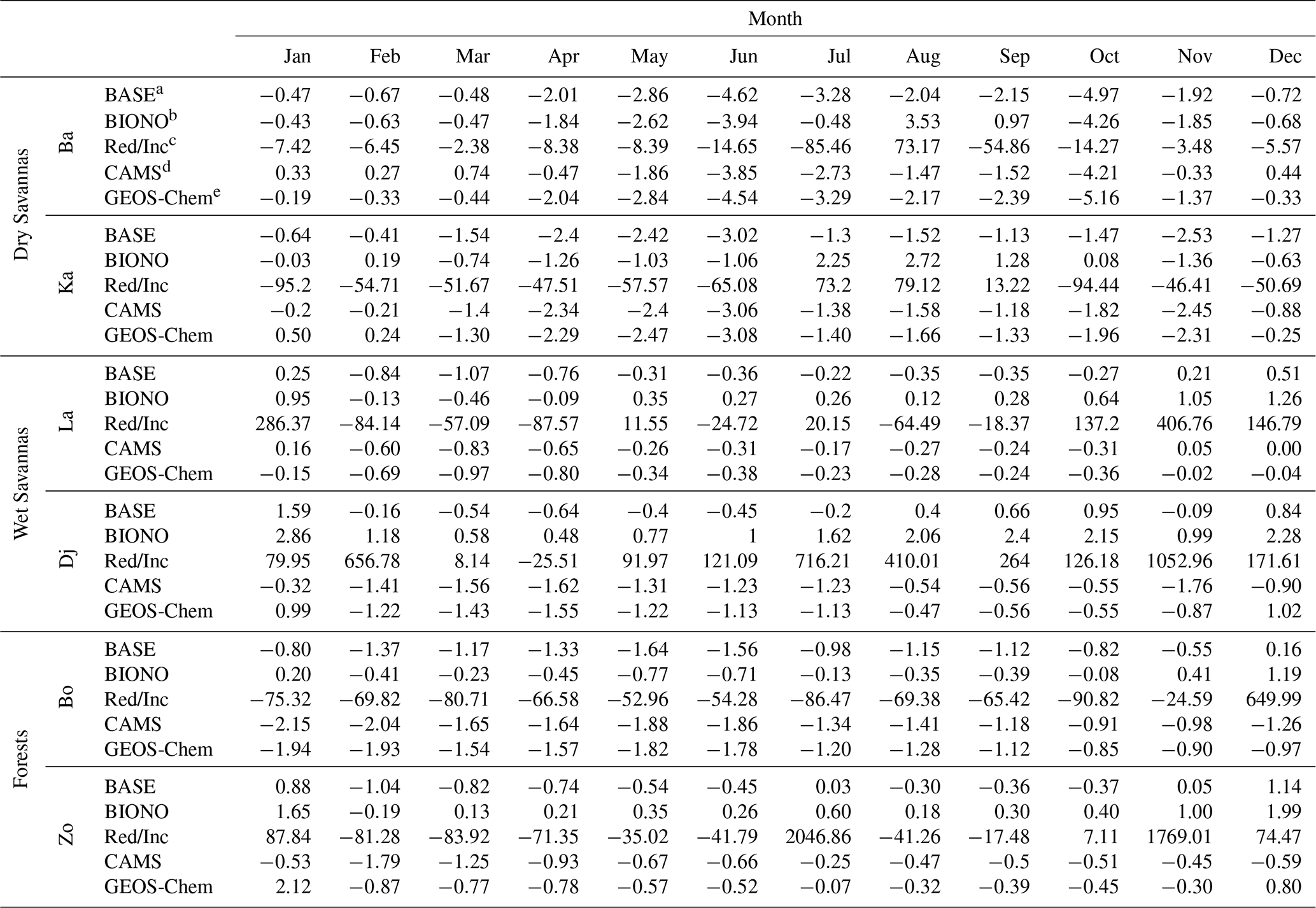 This difference in NO2 concentration can be attributed to differences in NO emissions (biomass burning, anthropogenic inventories and BioNO) as BioNO emissions were not accounted for in the BASE simulation (cf. Sect. .3). Indeed, CAMS includes BioNO emissions from a fixed climatology based on the Precursors of Ozone and their Effects in the Troposphere (POET) database for 2000 (Granier et al.2005) inventory, while GEOS-Chem parameterizes soil NO emissions dynamically using the Hudman et al. (2012) scheme. Differences in biomass burning injection heights and nitrogen fluxes considered in RegCM5 versus CAMS and GEOS-Chem could also explain differences in surface concentrations. The introduction of BioNO fills this gap to some extent, by increasing surface NO2 concentrations, bringing them closer to, and sometimes exceeding CAMS values (Fig. 6b and f). This is especially apparent in transitional ecosystems such as savannas and grasslands (see Fig. S1 in the Supplement). To assess the potential importance and to quantify the impact of BioNO emissions on lower troposphere NO2, we considere the difference between the BioNO and the BASE simulations (Fig. 7). The plots are shown for a vertical cross section averaged between −10 and 10° E, from 4 to 21° N.