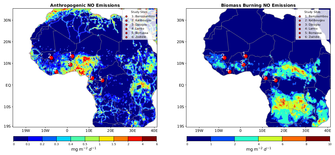 The model domain extends from 19.35° S to 35.48° N in latitude and from 24.98° W to 41.65° E in longitude, covering a large portion of the African continent. This domain was carefully selected to encompass key climatic and atmospheric processes relevant to the study, including the West African Monsoon, the Saharan Heat Low, and regions strongly influenced by biomass burning and anthropogenic emissions. While it does not cover the entire continent, the domain focuses on the most active regions for BioNO emissions and includes all of the INDAAF (International Network to study Depositions and Atmospheric chemistry in AFrica) measurement sites used for model evaluation. Figure 1 shows the model domain and the locations of the INDAAF measurement sites.