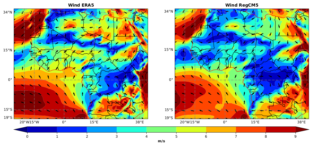 Figure 2 compares the ERA5 reanalysis to simulated mean wind at 850 hPa i.e. in the monsoon layer. RegCM5 manages to reproduce the main features of the monsoon circulation with a mean characteristic southwesterly flow of up to 17° N, and Harmattan-like circulation over northern Africa. However, the model tends to underestimate the intensity of the mean monsoon flow from the Gulf of Guinea to the Sahel. The monsoon front and the Saharan Heat Low (SHL) are also reasonably captured by the RegCM5 model, although the SHL amplitude is underestimated (Fig. 2). This could explain or contribute to the weaker Monsoon flux and the underestimation of sahelian precipitation discussed later (Fig. 3c), which is consistent with the connections described in Peyrillé et al. (2007), Lavaysse et al. (2009), Chauvin et al. (2010), Lavaysse et al. (2010) and Evan et al. (2015). Outside of the monsoon domain, the minimum central-equatorial African wind is consistently captured, compared to the ERA5 data.