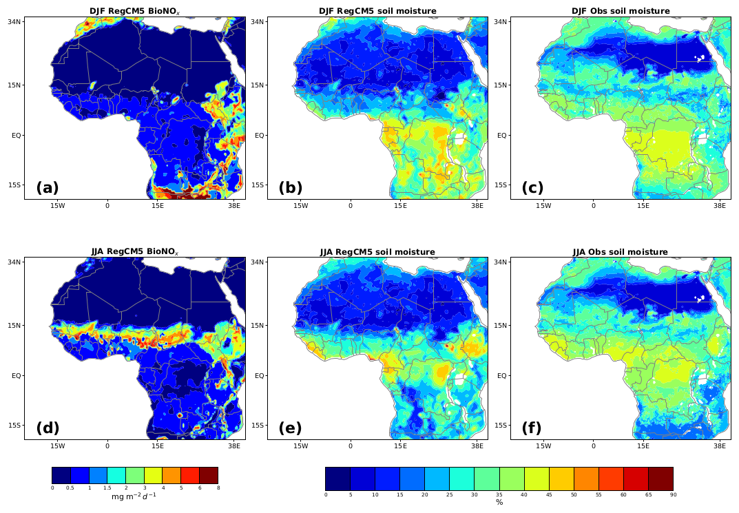 Integrating interactive BioNO emissions into regional climate system models allows studying the impact of present and future climate change and variability, including temperature and precipitation patterns, on BioNO emissions. This understanding is crucial for predicting possible future emission trends, potential changes in the chemical environment, and developing effective mitigation strategies. BioNO emissions can also affect the formation of ozone and other secondary pollutants, which has implications for air quality as well as climate forcing and responses. These knock-on effects can be calculated using coupled climate-chemistry systems. In addition to being able to include BioNO emissions and the consequent effects on secondary pollutants, the regional climate modelling approach adopted in this paper can also be used to study regional environmental disturbances such as land use and agricultural changes. Furthermore, since climatic and land use gradients are particularly important in west and central Africa, the dynamical downscaling capabilities offered by the regional climate modelling approach are also of particular interest for capturing regional contrasts in emissions and processes at play.
