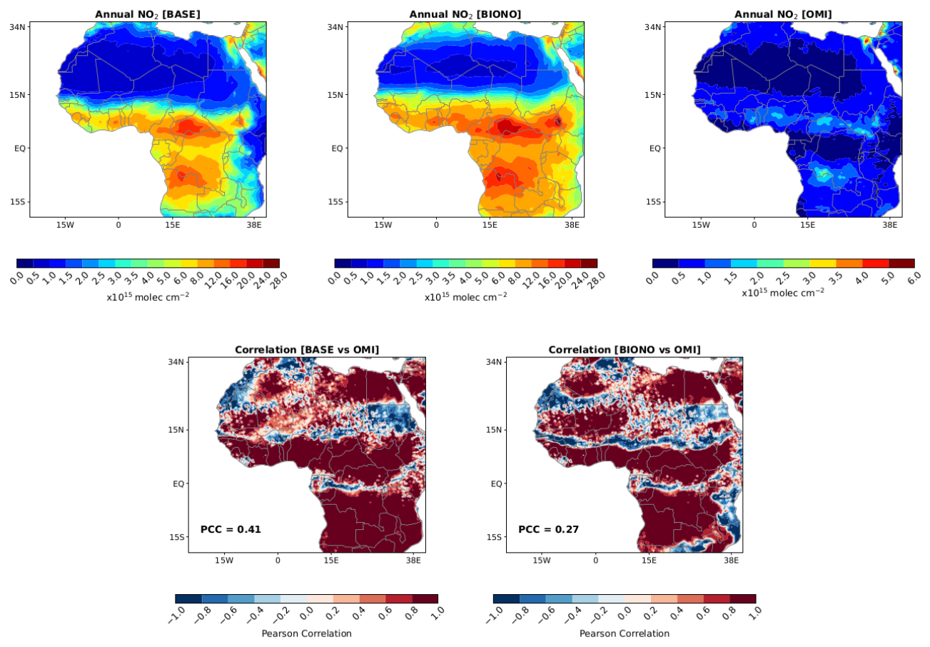 In tropical Africa, estimating BioNO emissions is challenging due to a lack of observational data (e.g., Jaeglé et al.2004; Van Der A et al.2008). Nevertheless, global and regional modelling approaches, have been proposed to quantify BioNO emissions (e.g., Hudman et al.2012; Stohl et al.1996; Stehfest and Bouwman2006; Yienger and Levy1995; Yan et al.2005) and evaluate the potential impact on atmospheric chemistry. For instance, Williams et al. (2009) used an inventory of biogenic emissions derived from multi-annual simulations of the ORCHIDEE (Organising Carbon and Hydrology In Dynamic Ecosystems) vegetation model (Lathiere et al.2006) to study the influence of BioNO and BVOC (Biogenic Volatile Organic Compound) emissions on Equatorial Africa's tropospheric composition. The global chemistry-transport model simulations revealed that NO emissions from soils in Africa contribute between 2 % and 45 % of tropospheric ozone production. Delon et al. (2008) used a neural network-based parameterization coupled with a mesoscale model to investigate the impact of BioNO emissions on NOx and O3 production in the lower troposphere over Equatorial Africa for a specific day (6 August 2006) during the AMMA (African Monsoon Multidisciplinary Analysis) campaign in the Sahel. Their findings indicate an increase in tropospheric O3 and NOx concentrations in the lowest few kilometres of the atmosphere when BioNO emissions are included. Steinkamp et al. (2009) used the ECHAM5/MESSy atmospheric chemistry model (EMAC) to examine the influence of BioNO on lower tropospheric NOx, O3, PAN, HNO3, OH, and the lifetime of CH4 (τCH4). Their results revealed that BioNO largely contributes to NOx levels, especially in the tropics. Moreover, BioNO notably raises OH concentrations, thereby increasing the global troposphere's oxidizing capacity and resulting in a 10 % decrease in τCH4.