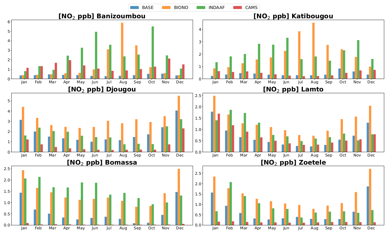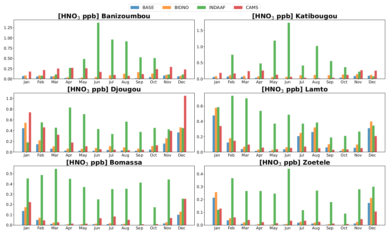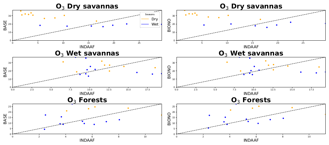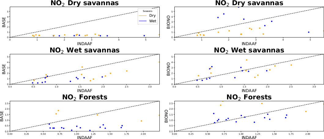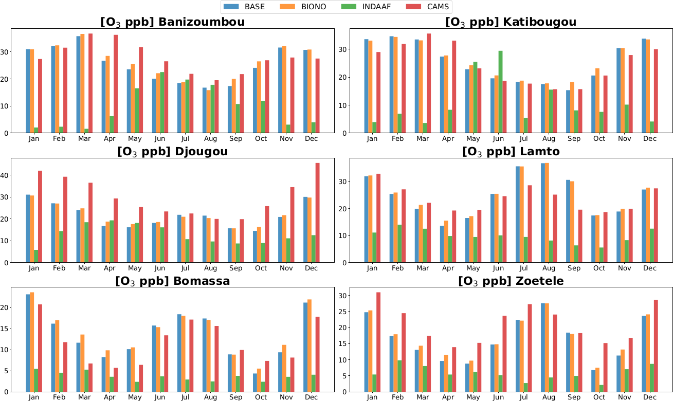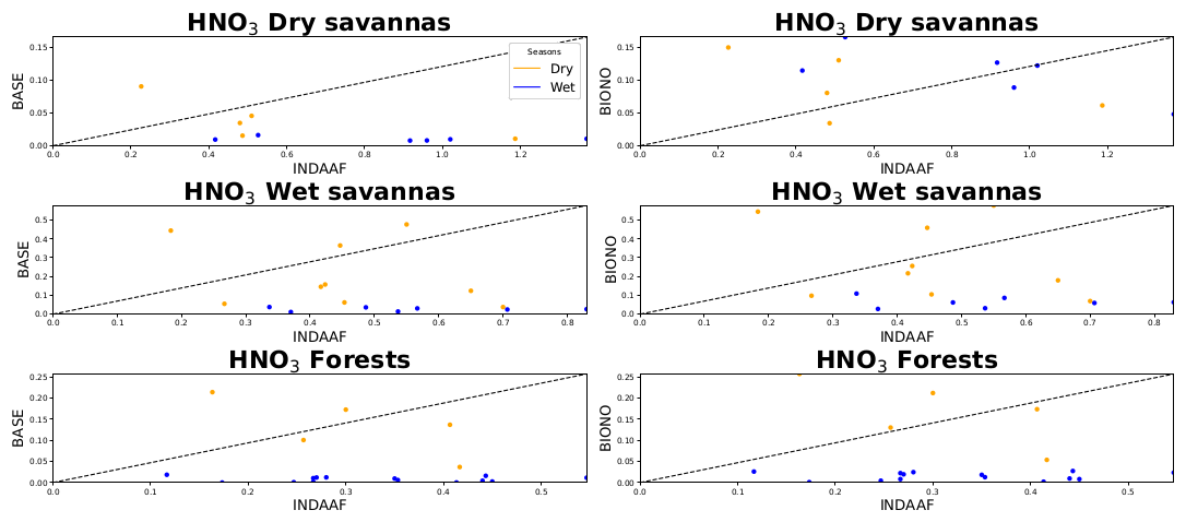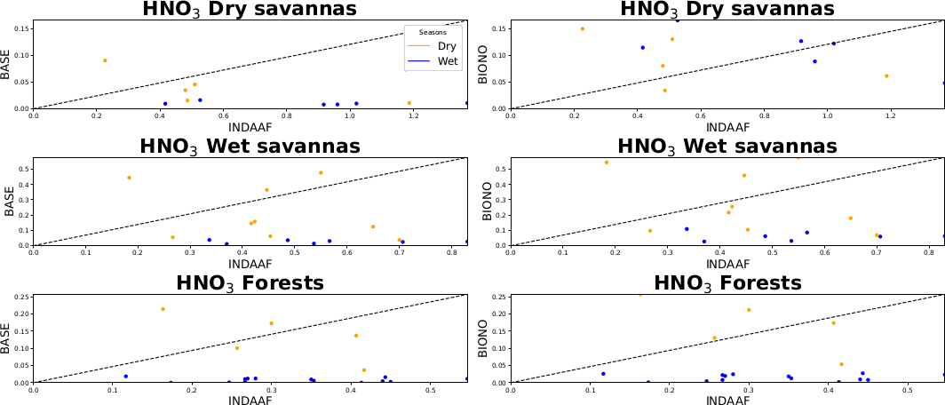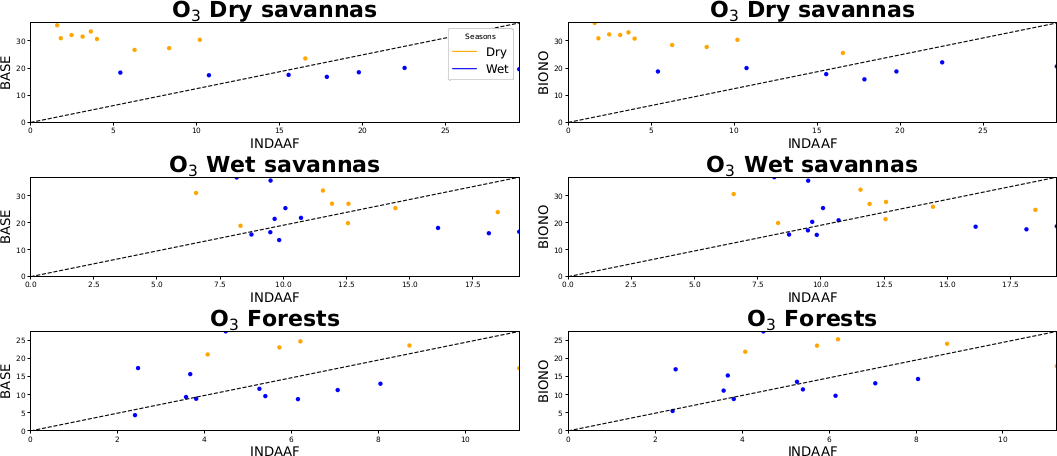 O3, NO2 and HNO3 concentrations are measured in the framework of the INDAAF long-term monitoring project. INDAAF, which is part of the Aerosol Cloud and Trace gases Infrastructure (ACTRIS-Fr), is a long term monitoring service to study the evolution of the atmospheric chemical composition and deposition in Africa. Gaseous concentrations are measured monthly at different sites in West and Central Africa and are publicly available (INDAAF2021). Datasets are referenced for each site: Banizoumbou (Laouali et al.2023), Katibougou (Galy-Lacaux et al.2023a), Djougou (Akpo et al.2023), Lamto (Galy-Lacaux et al.2023e), Bomassa (Galy-Lacaux et al.2023f) and Zoétélé (Ouafo-Leumbe et al.2023). We use observations from six sites representative of the main african ecosystems (Fig. 1, Table 2): Dry savannas (Banizoumbou, Katibougou), Wet savannas (Lamto, Djougou) and equatorial Forests (Bomassa, Zoétélé). Monitoring at Banizoumbou, Katibougou, Lamto, Bomassa and Zoétélé started in 1998, with the Djougou site joining in 2005. Atmospheric gas concentrations (NO2, HNO3, O3) are performed using passive sampling techniques based on the methodology outlined by Ferm et al. (1994). Developed by the Laboratory of Aerologie (LAERO) in Toulouse within the framework of the INDAAF project, these passive samplers have undergone rigorous testing across a range of tropical and subtropical regions (Adon et al.2010; Carmichael et al.2003; Ferm and Rodhe1997). Continuous measurements are ongoing at all INDAAF sites, and measurements were performed throughout the entire study period. Although there are some missing data for certain months in specific ecosystems, the overall dataset provides a comprehensive overview and is used as a reference dataset for model evaluation.