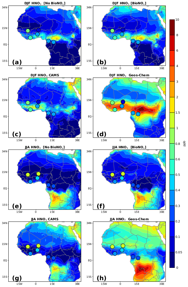 One goal of the present study is to evaluate and extend such a system based on the International Centre for Theoretical Physics Regional Climate Model version 5 (ICTP RegCM5) (Giorgi et al.2023). A second goal is to estimate and analyse the regional impact of BioNO emissions (from soils and vegetation) on key tropospheric species relevant to the atmospheric nitrogen cycle. The latter plays an important role in the chemistry of the atmosphere as well as the functioning of aquatic and terrestrial ecosystems and agrosystems (McNeill and Unkovich2007; Vitousek et al.1997). This N cycle is markedly disrupted by anthropogenic activities (agriculture, fossil fuel combustion, and biofuels) (Galloway et al.2008). This issue is particularly concerning in tropical regions like Africa, where rapid population growth and seasonal cycles from natural and anthropogenic sources strongly contribute to changes in N emissions (Adon et al.2010). We focus on NO2, HNO3, and O3 because these species are tightly interconnected and are involved in a range of environmental and health impacts. NO2, a key reactive nitrogen species, contributes to the formation of HNO3 and O3. HNO3 is formed when NO2 reacts with other substances in the atmosphere, and is an important contributor of rainfall acidity deposition and nitrogen supply to ecosystems. O3, a powerful oxidant, is influenced by the presence of NO2 and plays a crucial role in HNO3 formation. It also contributes to a range of environmental and health impacts, including reduced crop yields due to its phytotoxic effects and influences on ecosystem functioning (e.g., Ainsworth et al.2012). Understanding the concentrations and fluxes of these species is essential for assessing nitrogen management and potential risks in Africa.