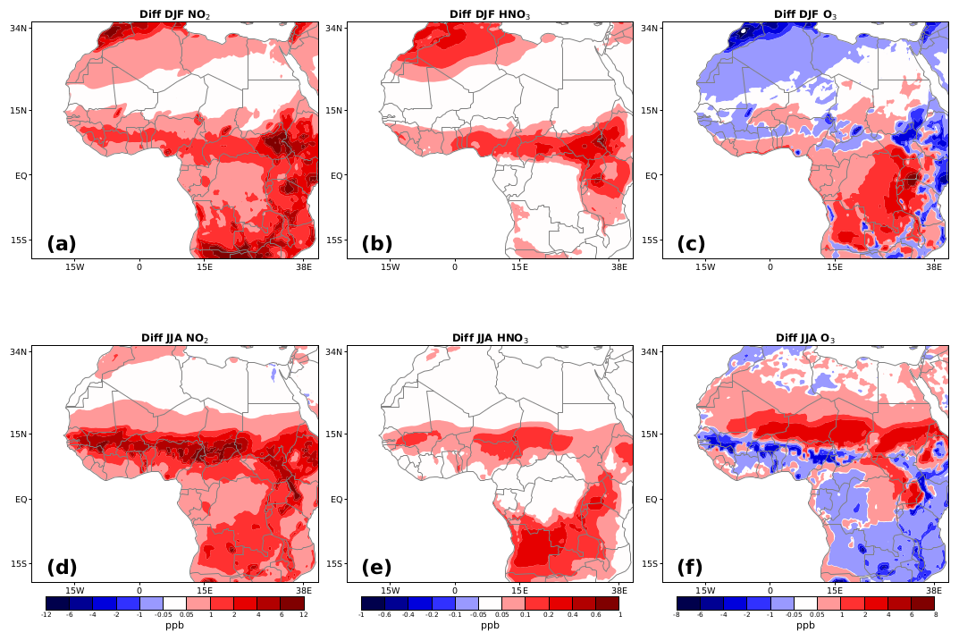 Figure 7DJF and JJA differences (BIONO – BASE) in NO2 (a, d), HNO3 (b, e) and O3 (c, f) concentrations, on the transect 4–21° N averaged between 10° W–10° E. Units are in ppb.