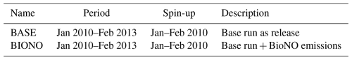 To test the ability of RegCM5 to simulate the African climate, BioNO emissions and to evaluate the effect of BioNO emissions on atmospheric chemistry, we conducted two different simulations which are listed in Table 1. The simulations cover the period from January 2010 to February 2013, which includes a variety of climatic conditions and seasonal variations. The first two months are used as spin-up time for both experiments and are not considered in the analysis of the results.
