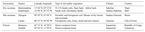 Table 2Site coordinates and location information. Dry savannas (ws: June–September, ds: October–May), Wet savannas (ws: April–October, ds: November–March), Forests (ws: March–November, ds: December–February). ws: wet season, ds: dry season.