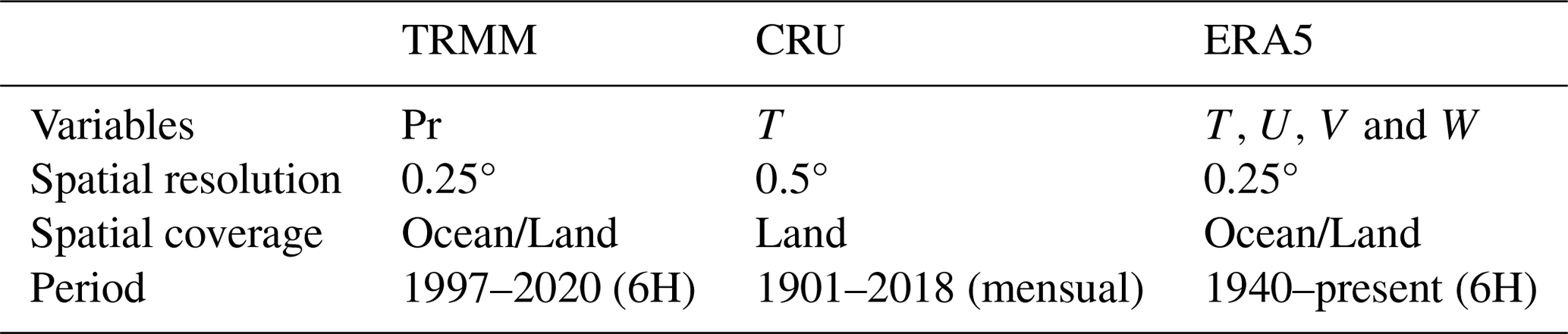 For further model evaluation, we use a variety of sources, including data from meteorological stations and satellites, as well as reanalysis products. Table 3 summarises information about the meteorological variables used from each database. Precipitation data are obtained from the Tropical Rainfall Measuring Mission 3B42-version 7 (TRMM; Huffman et al.2007). Temperature data are sourced from the Climatic Research Unit version TS4.03 (CRU; Harris et al.2020). For circulation dynamics, we use ERA5 data (Hersbach et al.2020). CRU data is exclusively based on in situ observations, while TRMM data originates from satellite observations. As mentioned above, ERA5 reanalysis data is derived from a combination of in situ measurements and satellite observations assimilated in a Numerical Weather Prediction model simulation. By using multiple sources of observational data (in situ and satellite) as well as reanalysis estimates, we are able to quantify and account for uncertainties in parameter estimates – precipitation (Pr), wind field (U, V, and W), and 2 m surface temperature (T). This is particularly relevant for Africa due to the limited availability of in situ measurements and the complexity of the regional climate.