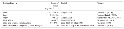 Nitrogen emissions originating from soil microbial processes are an important component of these emissions (Fudjoe et al.2023). Indeed, soil microbial processes, such as nitrification and denitrification involve the production of reactive gaseous compounds released to the atmosphere (Delmas et al.1995; Medinets et al.2015; Schreiber et al.2012). Soil NO (referred to as BioNO) emissions dominate the global net nitrogen oxide exchange between ecosystems and the atmosphere (Ludwig et al.2001), and above-canopy emission estimates ranging from 4.7–26.7 Tg N yr−1 (Davidson and Kingerlee1997; Ganzeveld et al.2002; Hudman et al.2012; Jaeglé et al.2005; Müller1992; Steinkamp and Lawrence2011; Vinken et al.2014; Yan et al.2005; Yienger and Levy1995). BioNO emissions play a crucial role in the formation of particles and key atmospheric gaseous compounds, such as O3 and HNO3 (Liu et al.2020; Mosier2001; Vinken et al.2014; Williams et al.2009). BioNO emissions are influenced by a variety of environmental and physical factors, including wind speed, floristic composition, nitrogen input (from organic and synthetic fertilization and atmospheric deposition), plant cover, soil temperature, soil moisture content, soil pH, and soil texture (Delon et al.2007; Williams et al.1992). Among these factors, soil moisture plays a dominant role in tropical regions, where seasonal rainfall patterns lead to marked fluctuations (particularly intense in Sahelian regions) in soil water content. This results in nitrogen accumulation during dry periods and important emission pulses following the onset of the rainy season (Austin et al.2004; Meixner and Yang2006; Johansson et al.1988; Yienger and Levy1995). Precipitation and soil moisture are recognized as key drivers of microbial processes that regulate NO fluxes (Liu et al.2009; Li et al.2022). While soil temperature and nitrogen content also influence NO fluxes, particularly in temperate zones, the pulse effect, which is driven by soil moisture, remains especially pronounced in tropical soils, where short but intense rainfall events can trigger sharp increases in NO emissions.