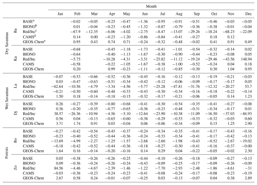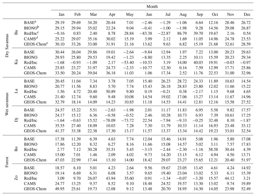 The limited flux measurements for BioNO emissions in Africa make a systematic evaluation of the model challenging. In this study, simulated BioNO emissions range from 0.02 to 7 mg m−2 d−1, corresponding to seasonally averaged flux values ranging from 0.1 to 37.52 ng N m−2 s−1. This is within the range found by both Delon et al. (2008) (from 0.43 to 6.52 mg m−2 d−1) and Davidson and Kingerlee (1997) (from 0.5 to 28 ng N m−2 s−1). The simulated BioNO values are also consistent with measured values from the flight B227 observed data of the British Aerospace 146 (BAe-146) under the Facility for Airborne Atmospheric Measurements (FAAM) program: 0.8 to 35 ng N m−2 s−1, but remain greater than estimations from Ganzeveld et al. (2002) for the Sahel region: 2.32 to 11.6 ng N m−2 s−1. Our simulated BioNO are in good agreement with NO fluxes from soil emissions measured during the DACCIWA field campaign West Africa) in June and July 2016, which ranged from 0 to 48.39 ng N m−2 s−1 (Pacifico et al.2019). Feig et al. (2008) also obtained NO flux fields in the range of 4.7 to 27.01 ng N m−2 s1, but for South Africa. A summary of these estimates is presented in Table 4. Additional measurements of BioNO emissions from wet African savannas can be found in Table 7 of Delon et al. (2012).