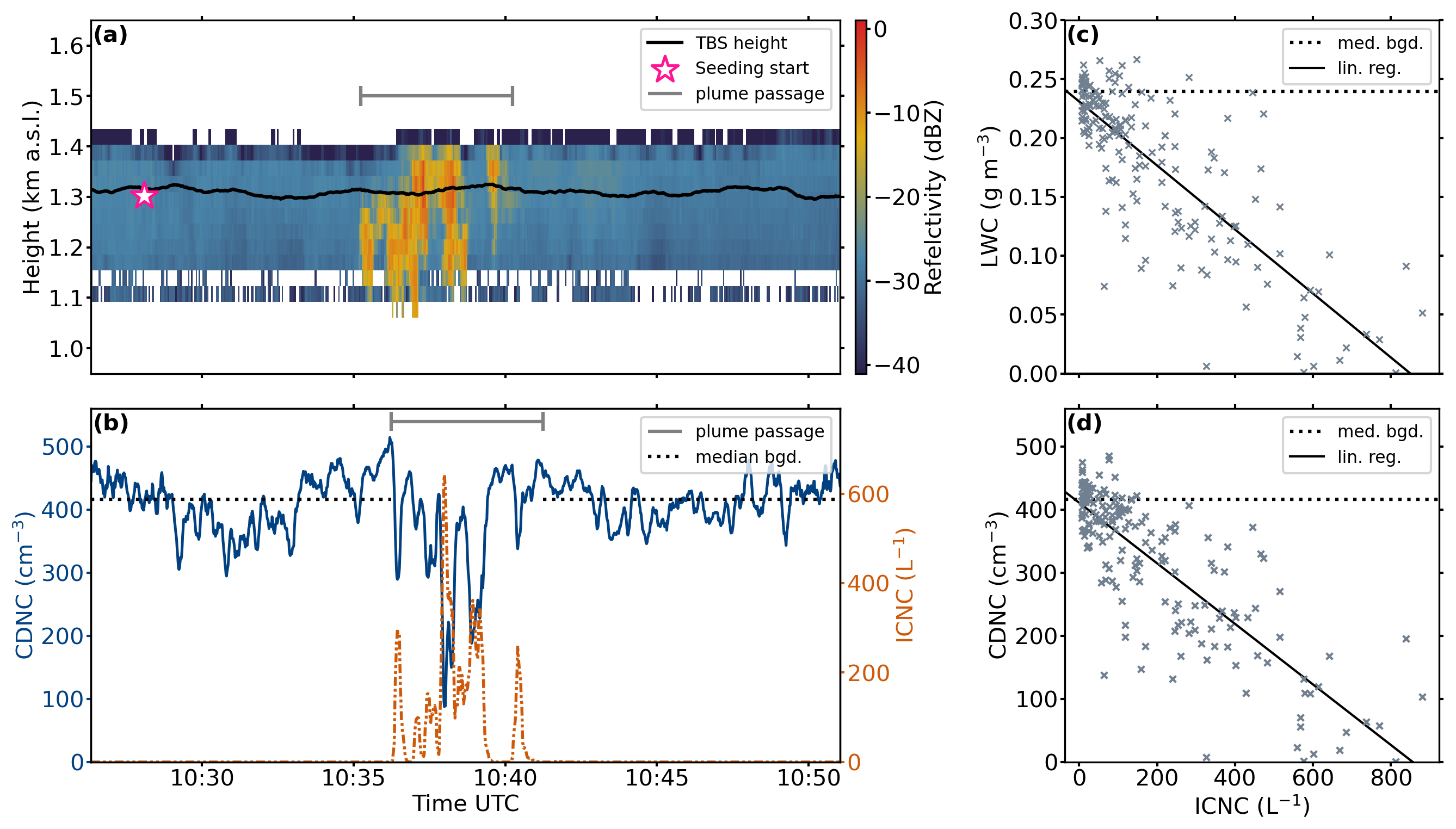 The observations of one seeding experiment (SE no. 3 at −5.5 °C and residence time of 8 min) performed on 25 January 2023 are shown in Fig. 2. The temporal evolution of the TBS height and radar reflectivity are shown in Fig. 2a, and the evolutions of the cloud droplet number concentration (CDNC) and ice crystal number concentration (ICNC) are shown in Fig. 2b. The cloud base is 1.1 , and the cloud top is ≈ 1.4 The unseeded background cloud has a mean reflectivity of dBZ, a median CDNC of ≈ 410 cm−3, and no ice crystals (Fig. 2a, b). While the observed CDNC is relatively high, it is not unprecedented for continental stratiform clouds (Miles et al., 2000). This particular example lies at the upper end of the range observed in our data set, which spans CDNC values between 170 and 540 cm−3. During the passage of the seeding plume, the radar reflectivity increases by 20 dBZ, the ICNC reaches values of ≥ 600 L−1 (10 s average), and the CDNC decreases by up to 75 %. A significant negative correlation is observed between the liquid water content (LWC) and the ICNC (Fig. 2c; Pearson r2=0.66) as well as between the CDNC and the ICNC (Fig. 2d; Pearson r2=0.68). These negative correlations between the liquid-phase parameters and the ICNC are clear indicators of the WBF process, where the liquid phase is depleted by the ice phase. We would also like to emphasize that we observe single patches that are fully glaciated, i.e., where CDNC and LWC reach 0, after only ≈ 8 min (Fig. 2c, d).