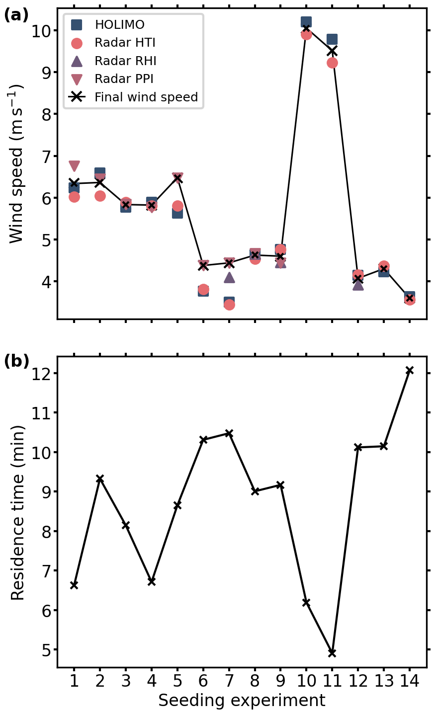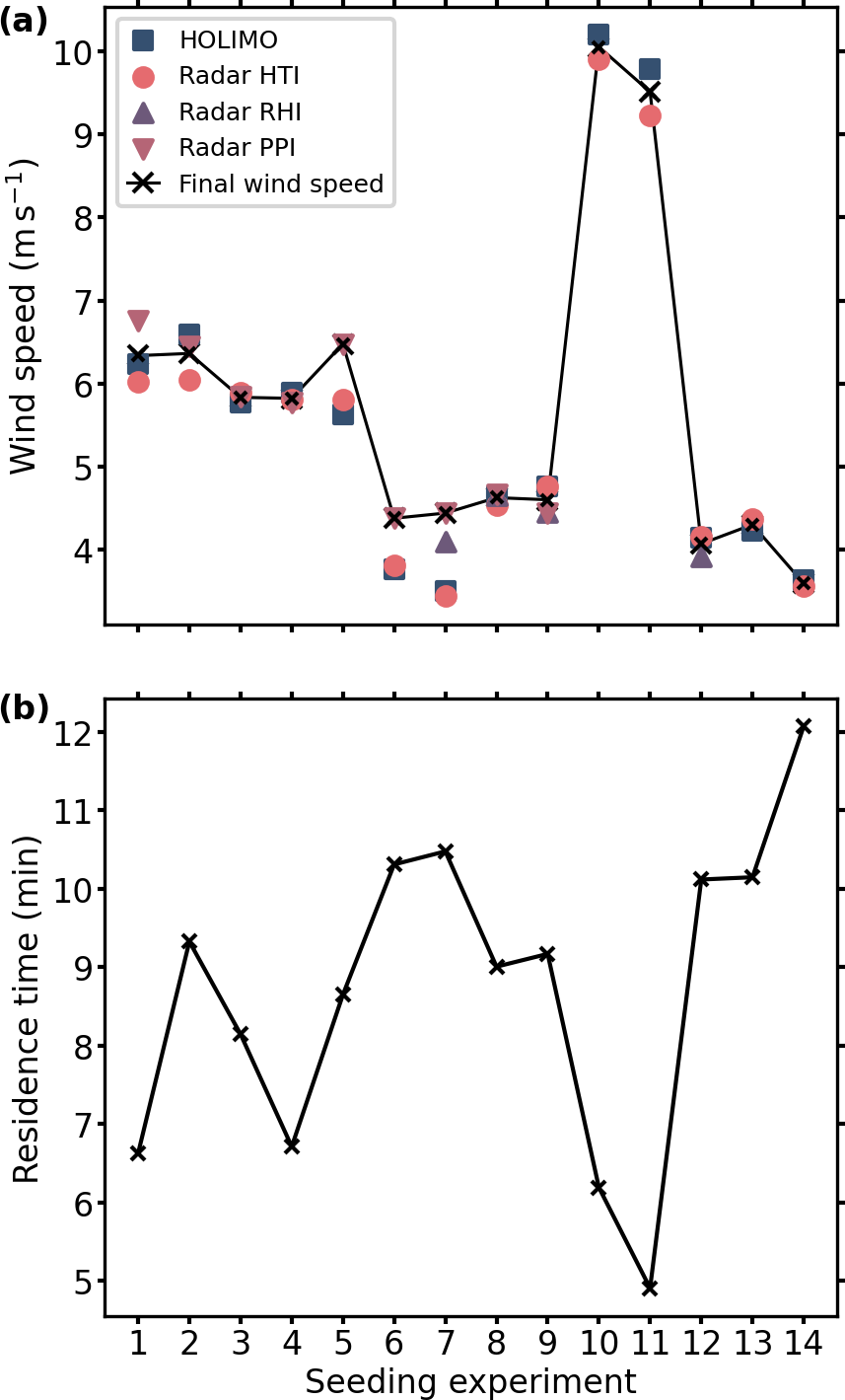Figure 3Wind speeds and residence times for all seeding experiments. (a) Wind speeds for each seeding experiment determined from in situ measurements by HOLIMO (blue squares), remote sensing observations of height–time indicator (HTI) measurements (red circles), range–height indicator (RHI) scans (purple upward triangles), and plan position indicator (PPI) scans (pink downward triangles). The final wind speed estimates for each seeding experiment are shown as a solid black line with crosses. (b) Calculated residence times for all seeding experiments using the wind speeds from (a) and the seeding distances from Table A1.