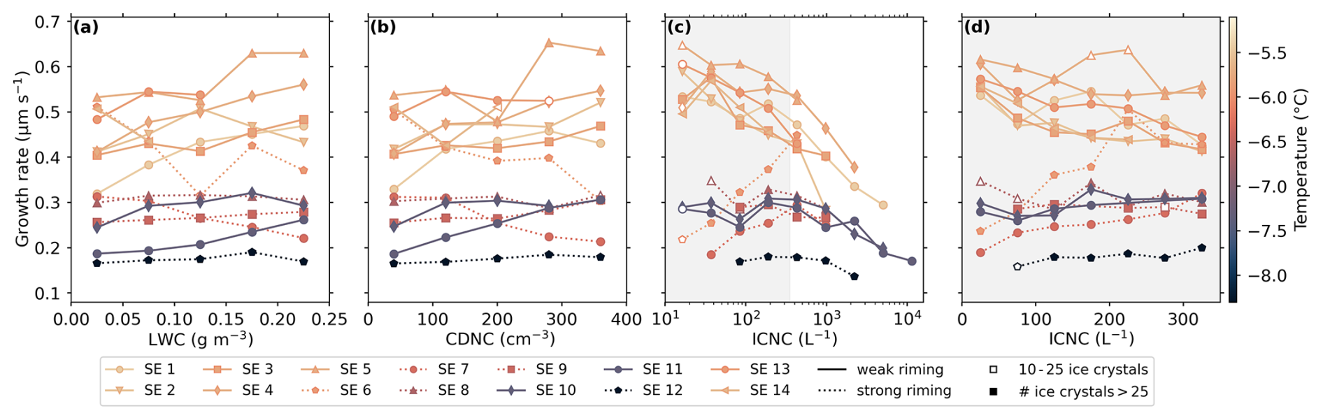 Figure 4Vapor diffusional ice crystal growth rates for the 14 seeding experiments (i.e., SE 1) versus liquid water content (LWC) in (a), cloud droplet number concentration (CDNC) in (b), and ice crystal number concentration (ICNC) with logarithmic scaling in (c) and linear scaling in (d) for a selected range (gray shading in c). Vapor diffusional growth rates are shown as mean values of the respective bins and are plotted at the bin centers with bin sizes of 0.05 gm−3 for the LWC, 80 cm−3 for the CDNC, 10 logarithmically scaled bins for the logarithmically plotted ICNC, and 50 L−1 for the linearly plotted ICNC. Values are shown only if >10 ice crystals fall in the bin, and unfilled markers indicate bins with 10–25 ice crystals. Experiments with weak or no riming are shown as solid lines, and experiments with strong riming are shown as dotted lines. The color indicates the temperature of each seeding experiment. Color map by Crameri (2023).