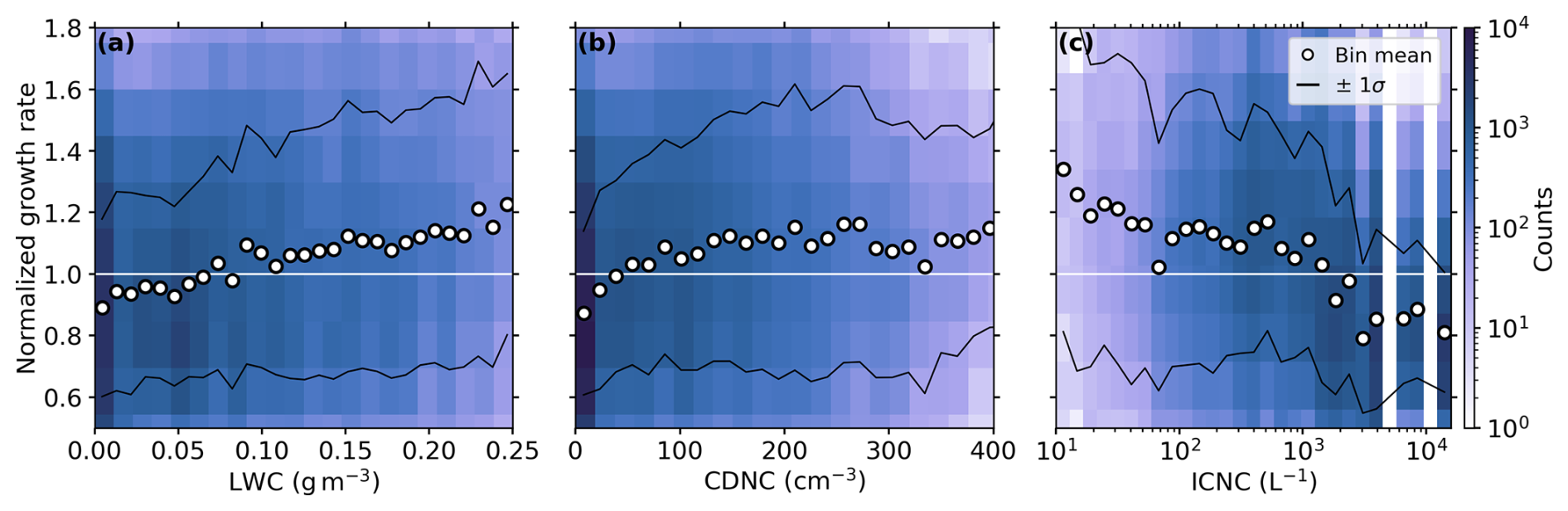 Figure 6Ice crystal growth rate distributions (color-coded in counts per bin) from all weak-riming seeding experiments (see Table A1), where the rates are normalized by the respective mean growth rate of each seeding experiment, vs. liquid water content (LWC) in (a), cloud droplet number concentration (CDNC) in (b), and ice crystal number concentration (ICNC) in (c). The mean growth rates of each vertical bin column (white circles) and the corresponding ±1σ standard deviations (solid black lines) are shown to better highlight trends in the distributions. The 1 line (solid white) is shown for better comparability. Color map by Crameri (2023).
