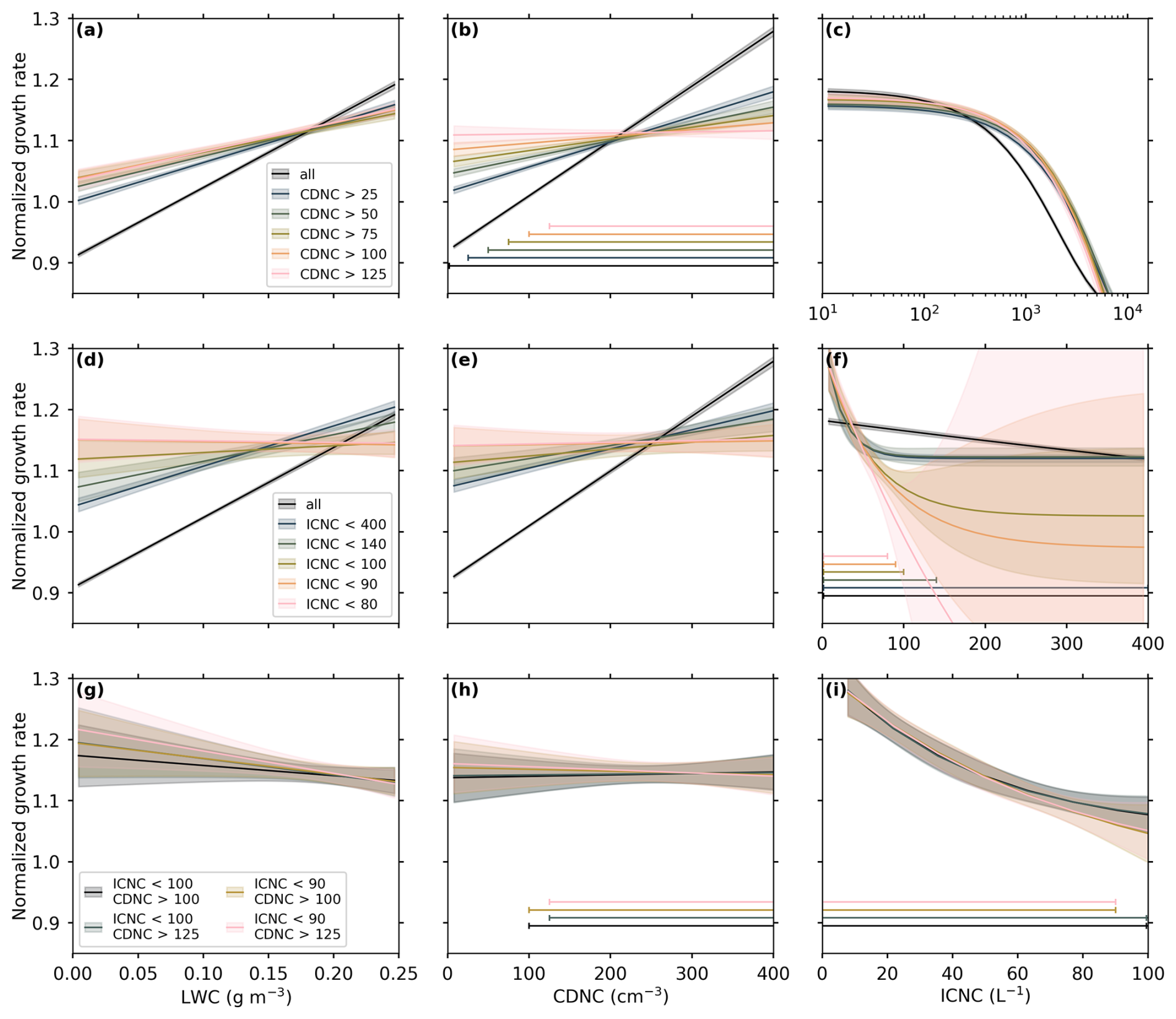 Figure 7Changes in the dependencies of diffusional ice crystal growth rates on cloud microphysical variables after applying a gradually increasing cloud droplet number concentration threshold (CDNCth) in (a)–(c), a gradually decreasing ice crystal number concentration threshold (ICNCth) in (d)–(f), and a combination of CDNCth and ICNCth in (g)–(i). The changes are visualized by linear fits for liquid water content (LWC) in (a),(d), and (g); cloud droplet number concentration (CDNC) in (b), (e), and (h); and exponential fits for ice crystal number concentration (ICNC) in (c), (f), and (i), together with their 95 % confidence intervals (shaded regions). The horizontal bars (bottom of b, f, h, and i) indicate the used range after applying the respective thresholds. The growth rate distributions (similar to Fig. 6) of all individual steps are shown in Figs. B1–B3, and fit parameters are given in Table B1. Color map by Crameri (2023).
