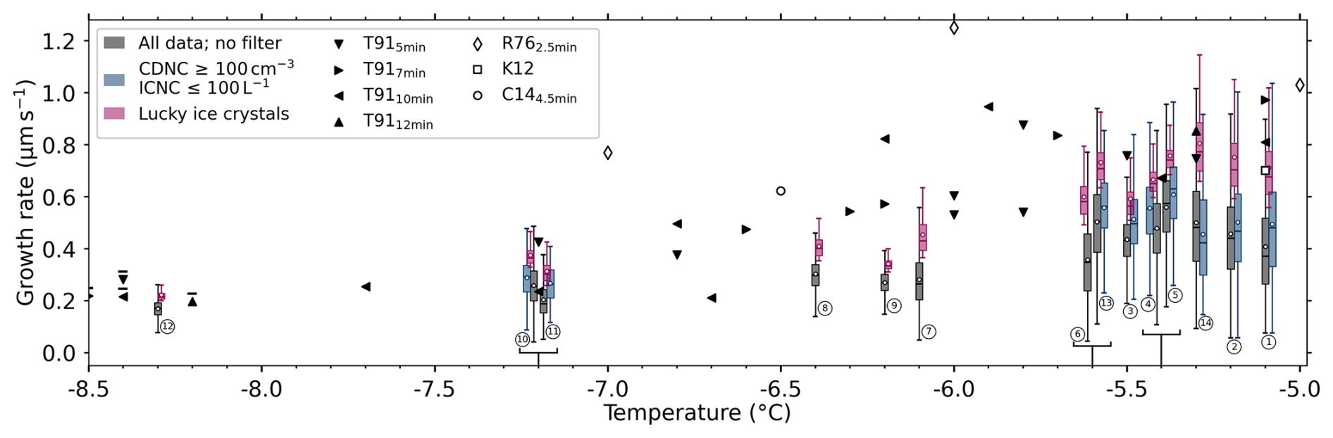 The diffusional growth rates along the major axis of pristine ice crystals versus temperature for the 14 seeding experiments of this study are shown in Fig. 8, together with growth rates from laboratory-based studies of Ryan et al. (1976), Takahashi et al. (1991), Knight (2012), and Castellano et al. (2014). For each seeding experiment, we report a distribution of diffusional growth rates based on the three previously described filtering approaches: (1) unfiltered ice crystal data; (2) filtering based on thresholds of cloud microphysical variables (CDNC and ICNC; see Sect. 3.2); and (3) the lucky ice crystal approach, with filtering based on ice crystal sizes (80th percentile; see Sect. 3.3).