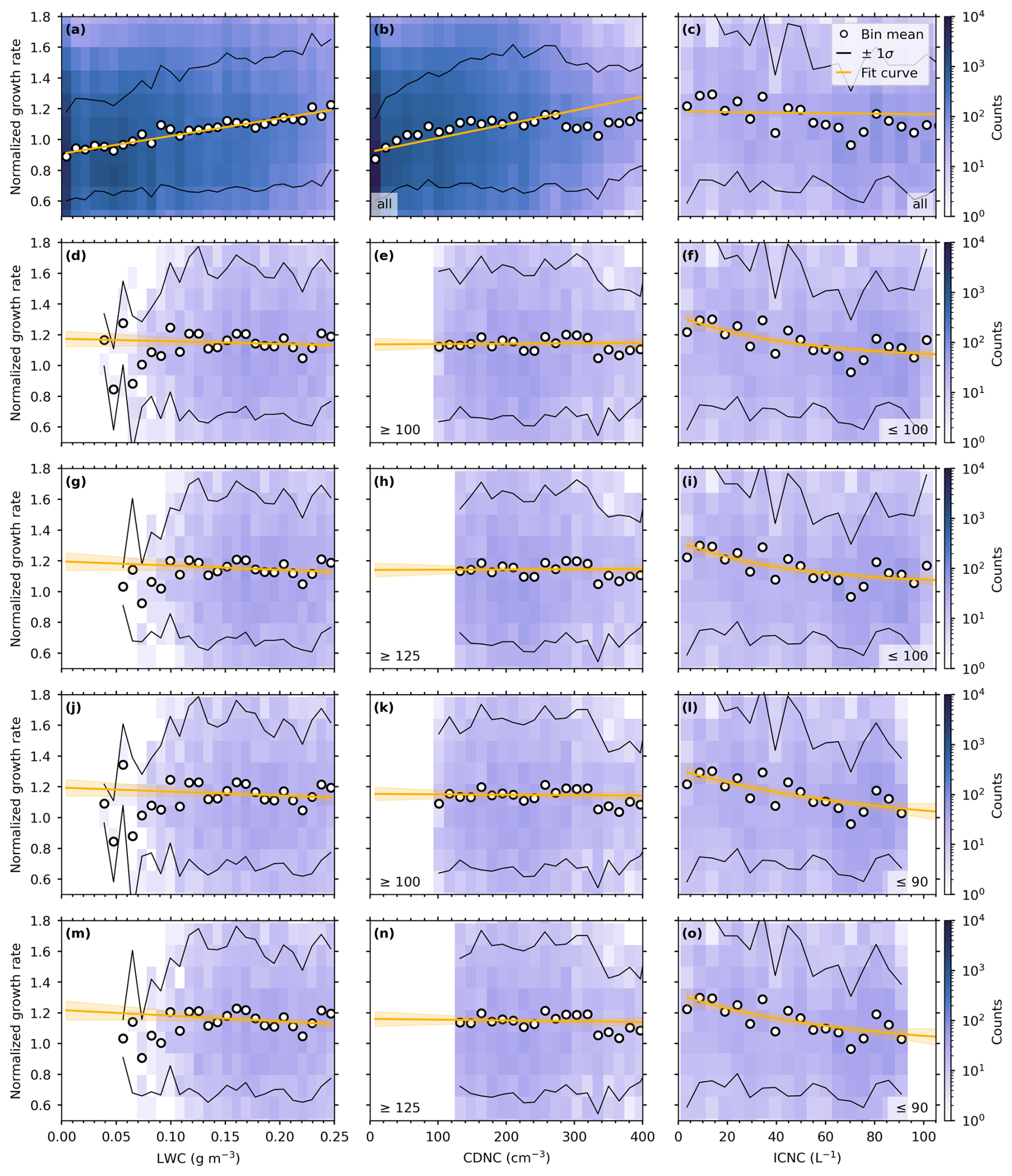 Figure B1Ice crystal growth rate distributions (color-coded in counts per bin) from all weak riming seeding experiments (see table A1), where the rates are normalized to the respective mean growth rate of each seeding experiment. Five gradually increasing (top to bottom) cloud droplet number concentration thresholds (CDNCth, given in the lower left corner of the middle column) are applied to the data set and shown vs. the liquid water content (LWC) in left column, the cloud droplet number concentration (CDNC) in the middle column, and ice crystal number concentration (ICNC) in the right column. The mean growth rates (white circles) and respective ±1σ standard deviations (solid black lines) for each column of bins are shown to better highlight trends of the distributions. Linear fits are used for the LWC and CDNC and exponential fits for the ICNC (solid orange; 95 % confidence interval shading). The fits are based on the normalized ice crystal growth rate distributions to include a frequency-of-occurrence-based weighting, and fit parameters are given in Table B1. Color map by Crameri (2023).