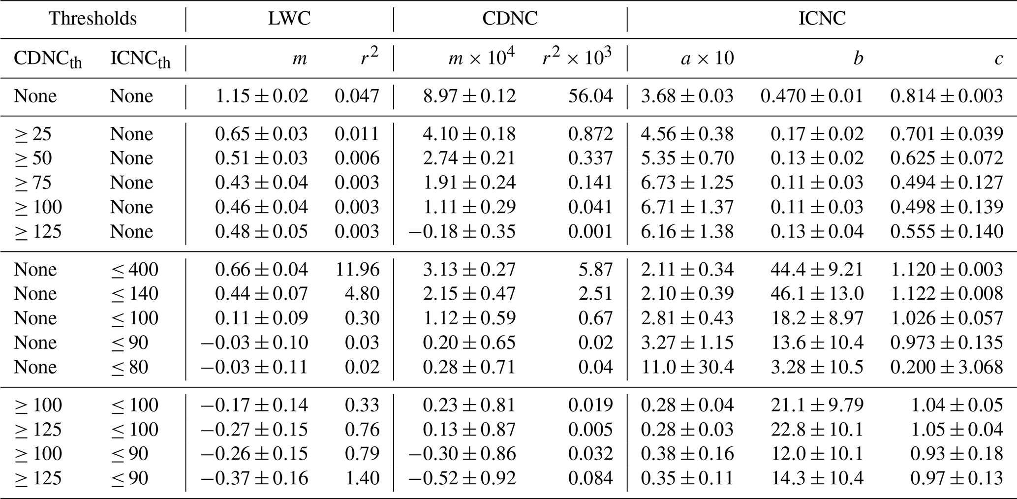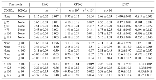 Table B1Retrieved fit parameters of the linear curves () for the liquid water content (LWC) and cloud droplet number concentration (CDNC) and exponential curves () for the ice crystal number concentration (ICNC) after applying cloud droplet number concentration thresholds (CDNCth) and ice crystal number concentration thresholds (ICNCth) to the normalized ice crystal growth rate distribution of Figs. B1–B3. These parameters are also used to generate the curves in Fig. B1.