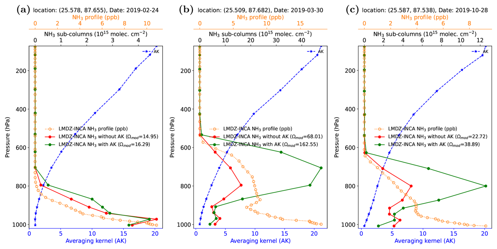 In order to illustrate the impact of the AK on modeled NH3 total columns, Fig. 1 shows LMDZ-INCA simulated NH3 mole fraction vertical profiles over a model grid cell in India on three clear-sky days (24 February, 30 March, 28 October) in 2019 and the modeled NH3 sub-columns with and without application of the AKs corresponding to one of the IASI pixels in that model grid cell, obtained from the modeled NH3 mole fraction profile interpolated on the vertical levels of IASI-ANNI-NH3-v4 retrievals. Despite the AK values varying relatively smoothly with altitude above the ground surface, the application of the AK can amplify modeled NH3 sub-columns at higher altitudes compared to those calculated without the AK (Fig. 1). This effect is generally due to the interaction between the vertical structure of the modeled NH3 vertical profile and the thickness (or pressure width) of the sub-columns. Because each NH3 sub-column represents the mass of NH3 within a specific pressure layer, layers with both significant NH3 concentrations and wider pressure intervals can result in larger NH3 sub-column values, even if the AK is not at its peak for those layers (Fig. 1). Consequently, even modest AK values at higher altitudes, combined with substantial NH3 mass in thick pressure layers, can lead to amplified contributions to the total column. The subfigures in Fig. 1 show that the LMDZ-INCA NH3 local vertical profiles mostly decrease with altitude and are almost similar to the Gaussian-shaped NH3 vertical profile centered at the land surface used as a prior in the IASI-ANNI-NH3-v4 retrievals. However, the model-simulated vertical NH3 profiles for some days (e.g., Fig. 1b) deviate from such a general smoothed NH3 vertical profile shape assumed in the IASI NH3 retrievals and show secondary peak(s) at some higher altitude. Although a short-lived species like NH3 largely resides within the atmospheric boundary layer and the long-term averaged NH3 vertical distribution in the boundary layer or in the lower troposphere could be assumed as smoothly decreasing with the altitudes, with maximum at the land surface, high-temporal-scale NH3 vertical profiles corresponding to the IASI overpass time can be a little more complex than this averaged smoothed profile, as observed in both model simulations (Fig. 1b) and aircraft- and surface-based in situ measurements (Cady-Pereira et al., 2024; Guo et al., 2021; Pu et al., 2020). This suggests a potential need to refine the assumed NH3 vertical profile for more accurate satellite NH3 retrievals, though the necessity for this refinement may depend on specific locations and meteorological conditions. Across all these days, the application of the AKs results in higher LMDZ-INCA NH3 total column values compared to the ones without applying the AKs. The AK from the ANNI-NH3-v4 product often exhibits magnitudes exceeding unity at altitudes corresponding to the LMDZ-INCA NH3 sub-column peak altitudes. This results in larger modeled NH3 total column values when using the AK.