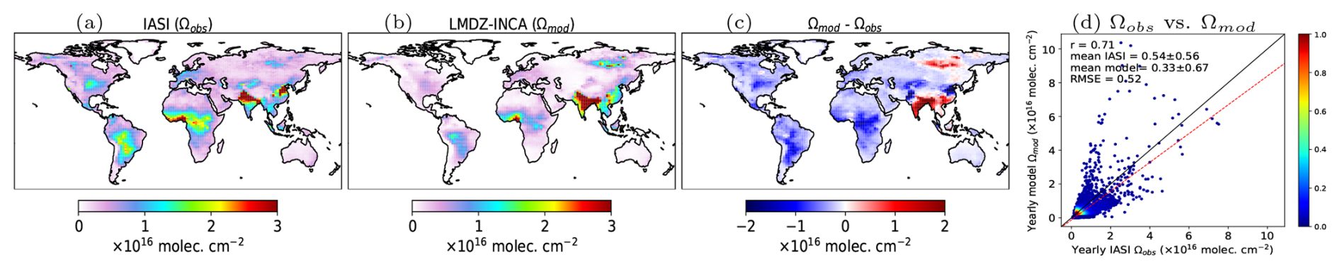 Figure 2 compares the annual mean modeled LMDZ-INCA NH3 columns (Ωmod) with the observed IASI NH3 column retrievals (Ωobs) regridded on the LMDZ-INCA model grid (1.27° × 2.5°) worldwide over land for the year 2019 (Fig. S7 for all 4 years from 2019 to 2022). It shows that the annual mean worldwide spatial distributions of the modeled NH3 columns are approximately similar to those of the IASI NH3 retrievals and that there is a good spatial correlation (r=0.71) between them. However, the IASI NH3 observations indicate higher NH3 abundance compared to the LMDZ-INCA simulations across most of the regions worldwide, except over the South Asia and Eastern Siberia regions (Fig. 2). We observe an overall underestimation of the global annual mean LMDZ-INCA NH3 columns Ωmod (mean: 0.33×1016 molecules cm−2) compared with the observed IASI retrievals Ωobs (mean: 0.54×1016 molecules cm−2). The RMSE between the annual mean gridded Ωmod and Ωobs worldwide is 0.52×1016 molecules cm−2.