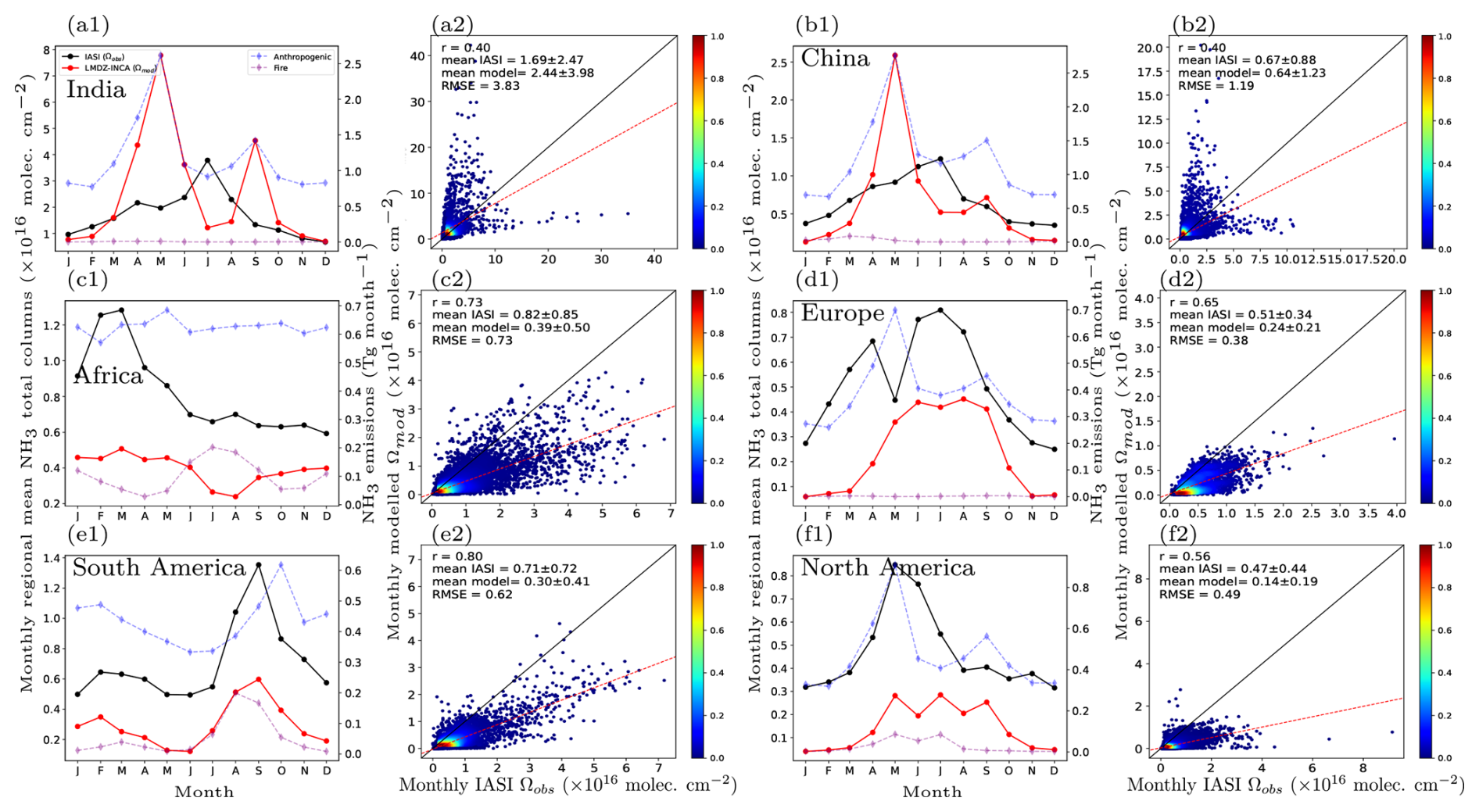 Figure 3The monthly regional mean time series of the observed IASI NH3 total columns (Ωobs), the corresponding LMDZ-INCA modeled columns (Ωmod) (primary y axis), and the monthly anthropogenic (CEDS) and fire (GFED4) NH3 emissions (secondary y axis) from bottom-up inventories used in the model simulations for the year 2019 for different selected regions: (a) India, (b) China, (c) Africa, (d) Europe, (e) South America, and (f) North America (first column). The second column in each subfigure shows the scatter density plots between the monthly mean gridded observed IASI and the corresponding modeled NH3 total columns over the land grid cells at 1.27° × 2.5° resolution in each region. In the scatter plot, the solid black lines represent the one-to-one line, while the dashed red lines represent the regression line.